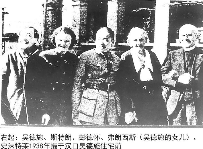 1938年,美国友人鲁兹(右一)及女儿弗兰西斯(左二)、美国记者斯特朗(右二)、史沫特莱(左一)和彭德怀在汉口鲁兹住宅前合影。斯特朗、史沫特莱都将武汉抗战时讯发往欧美主流媒体。(资料图片)