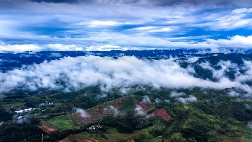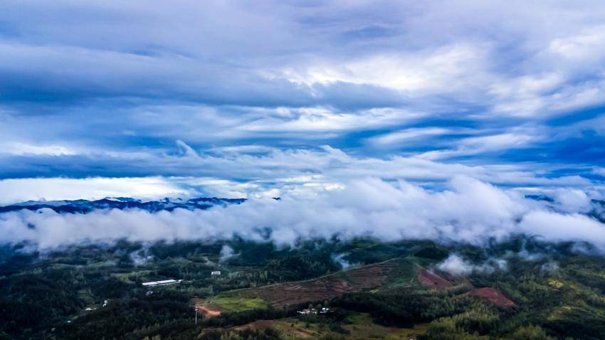 云雾贴着地面缓缓流动,像是大地呼出的气息。山间草木挂满了晶莹的水珠,宛如镶嵌着无数颗璀璨的宝石。一阵夹杂着水汽的山风吹过,云雾瞬间被吹散,露出了青山的真面目,眼前豁然开朗,让人惊叹大自然的神奇。