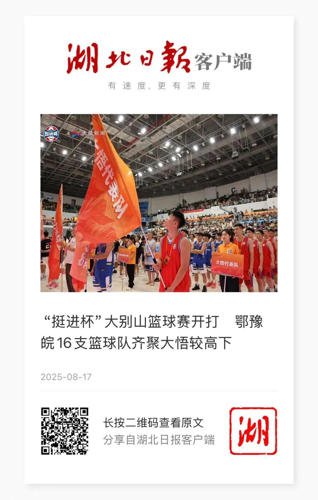 8月17日,湖北日报客户端报道《“挺进杯”大别山篮球赛开打 鄂豫皖16支篮球队齐聚大悟较高下》