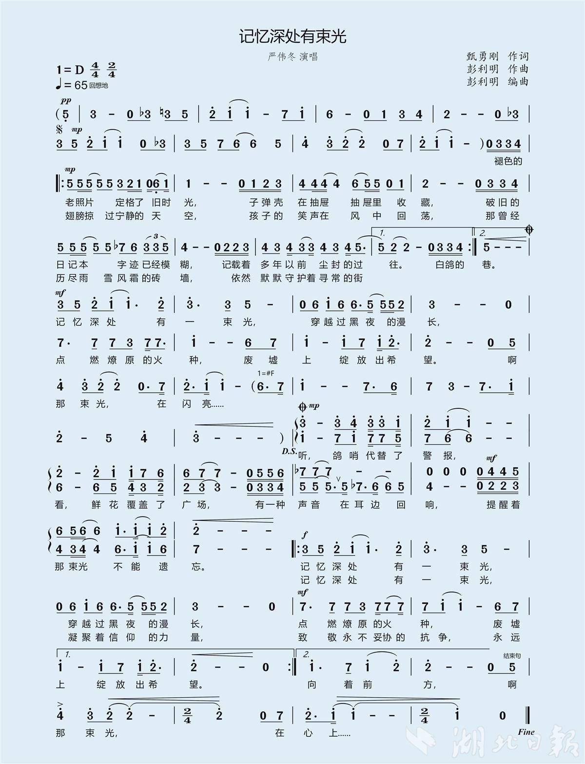 湖北日报讯(记者农新瑜、通讯员筱露)“听,鸽哨代替了警报,看,鲜花覆盖了广场,有一种声音在耳边回响,提醒着那束光不能遗忘……”9月1日,由武汉知名音乐人彭利明作曲、甄勇刚作词、严伟东演唱的新歌《记忆深处有束光》MV正式上线发布。主创团队表示,这是一首为纪念中国人民抗日战争暨世界反法西斯战争胜利80周年而作的献礼之作,以歌声铭记历史,抒发家国情怀。