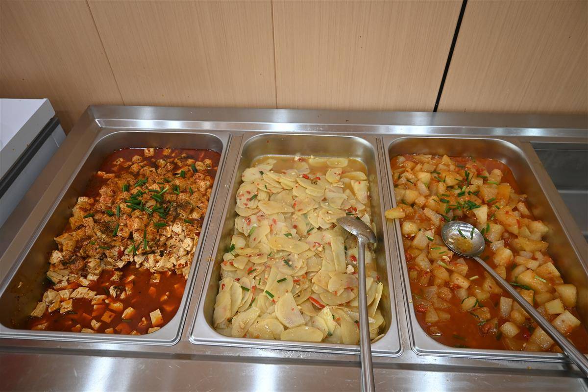 临近中午,餐厅逐渐热闹起来。11时40分左右,土豆片、红烧冬瓜和清炒小白菜即将见底,厨房迅速补菜品。