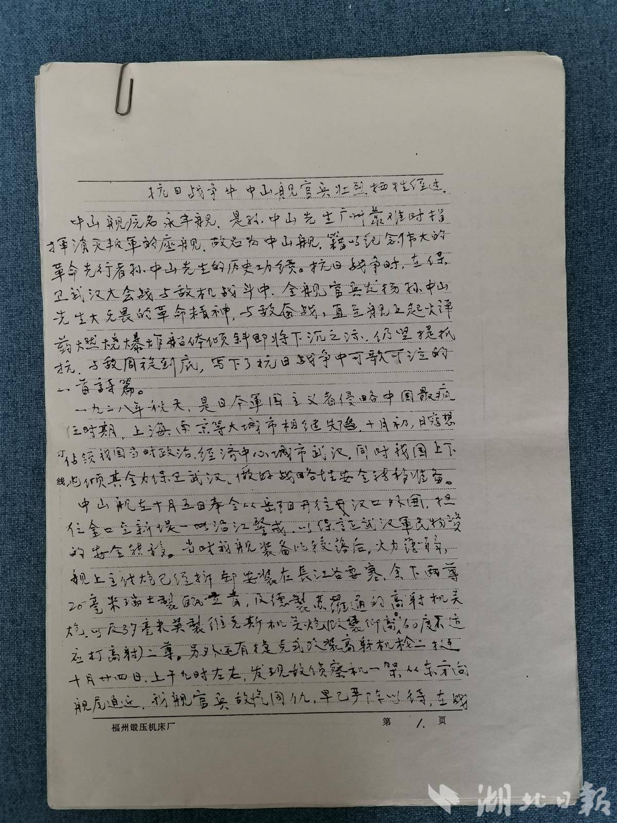 中山舰幸存者魏振基手稿回忆“抗日战争中中山舰官兵壮烈牺牲经过”(湖北日报全媒记者 海冰摄)