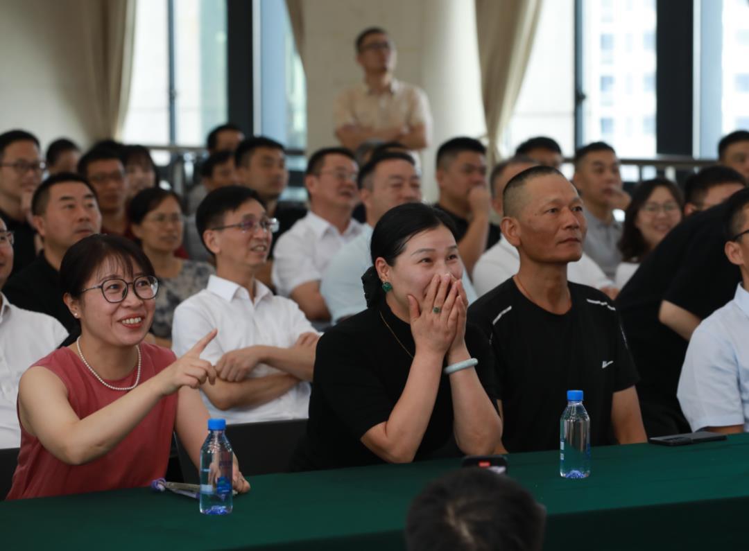 吴娟芳(一排右二)和李全观(一排右一)在老家观看阅兵仪式直播(图源平湖市传媒中心)