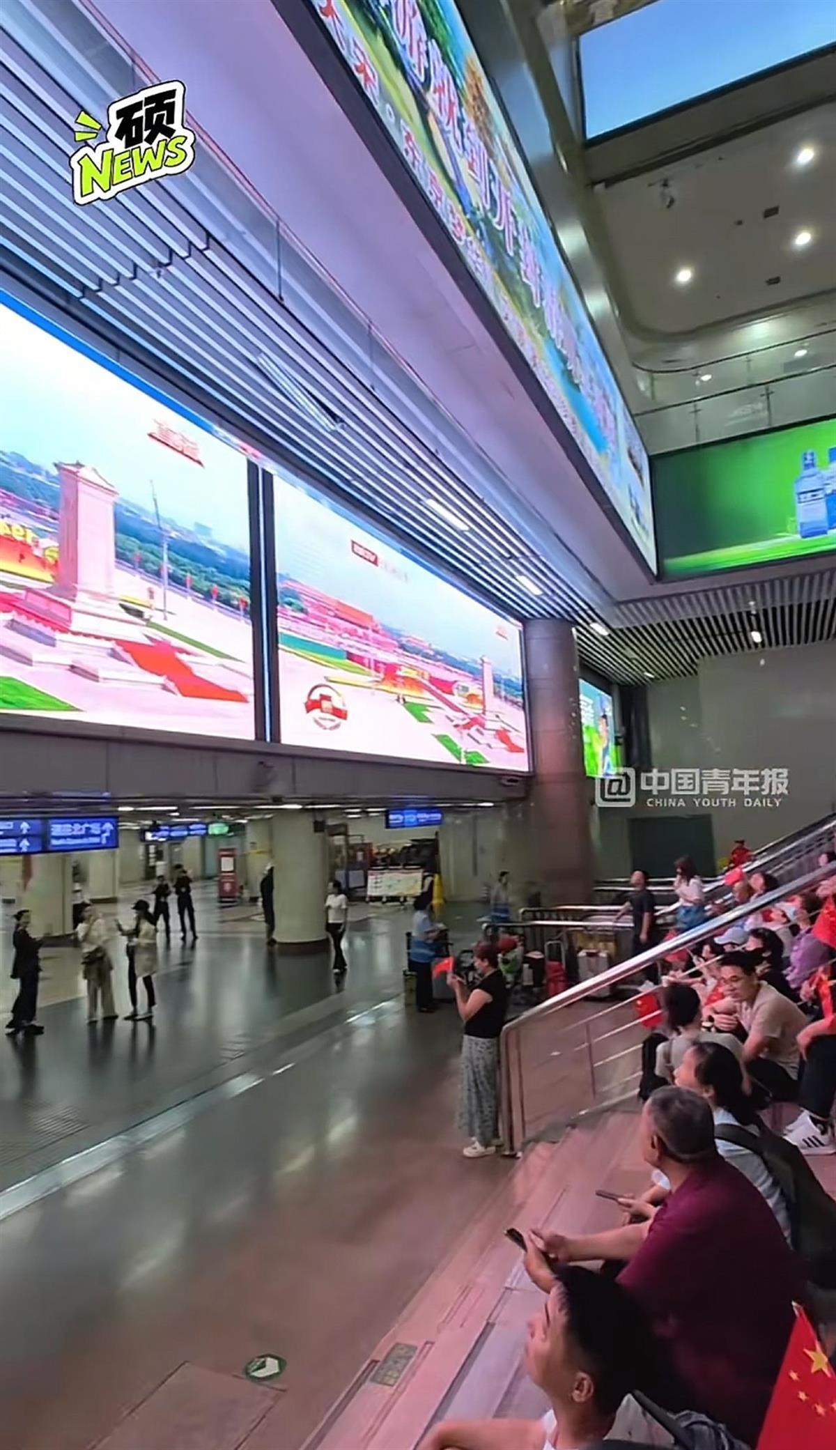 北京南站的旅客驻足观看阅兵(图源:北京青年报)
