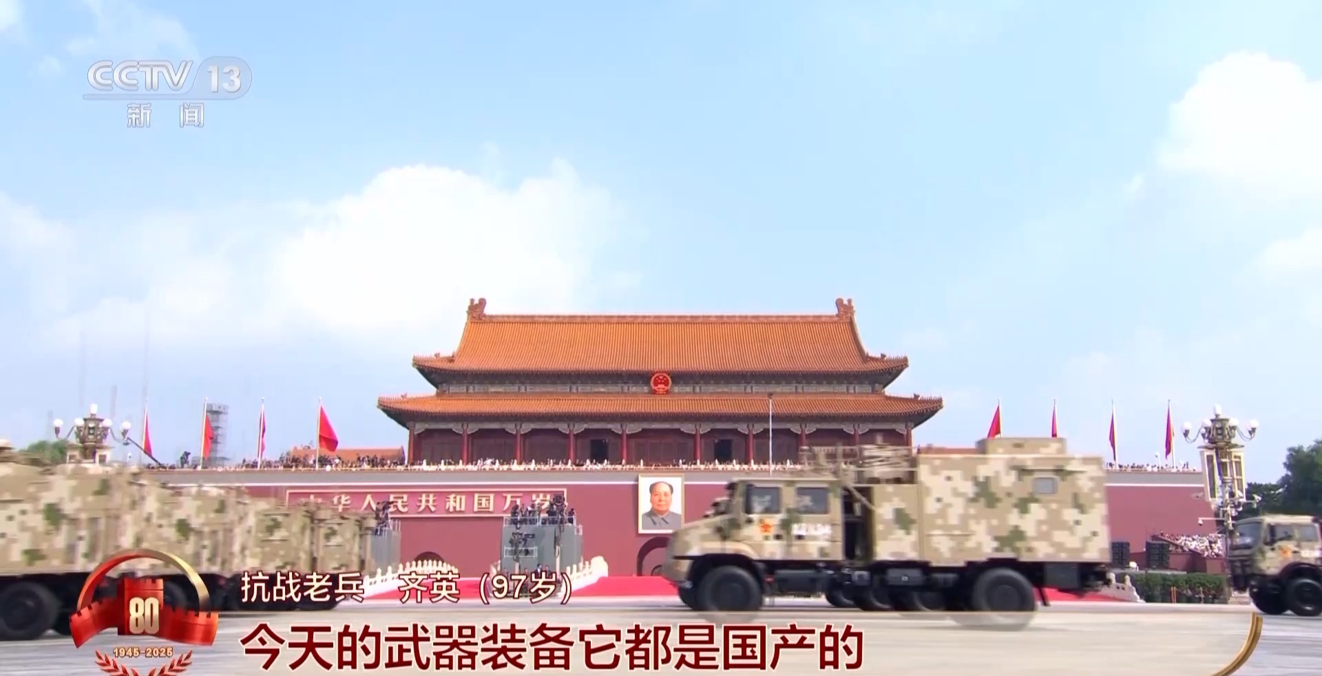抗战老兵 齐英:今天的武器装备都是国产的。国产的也很先进在世界上,战机、轰炸机、航母全都是国产的,国防力量强大。高兴,珍惜现在的生活,祝国家繁荣昌盛,越来越好。