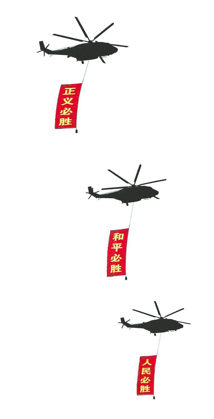 空中护旗梯队通过天安门广场,3架直升机分别悬挂“正义必胜”“和平必胜”“人民必胜”条幅。