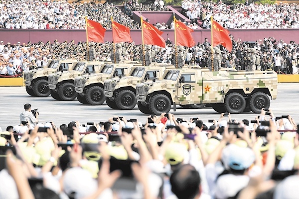 由东风猛士军车组成的战旗方队接受检阅 新华社发