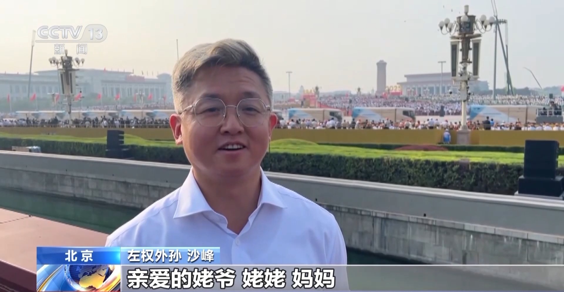 左权外孙 沙峰:亲爱的姥爷姥姥妈妈,你们看我在什么地方,在天安门广场,咱们一起到这里来看观礼,我相信你们看到这些一定会感到欣慰的。让我们一起来观看我们的部队的威武雄壮,来看我们国家的富强。