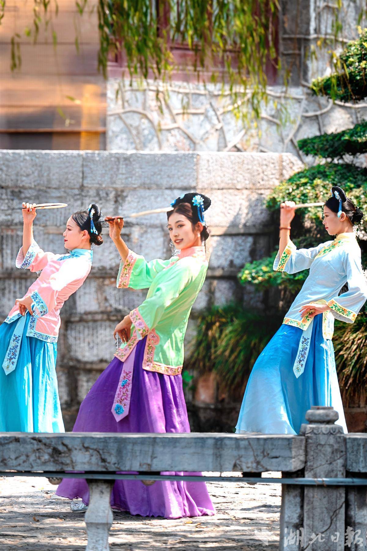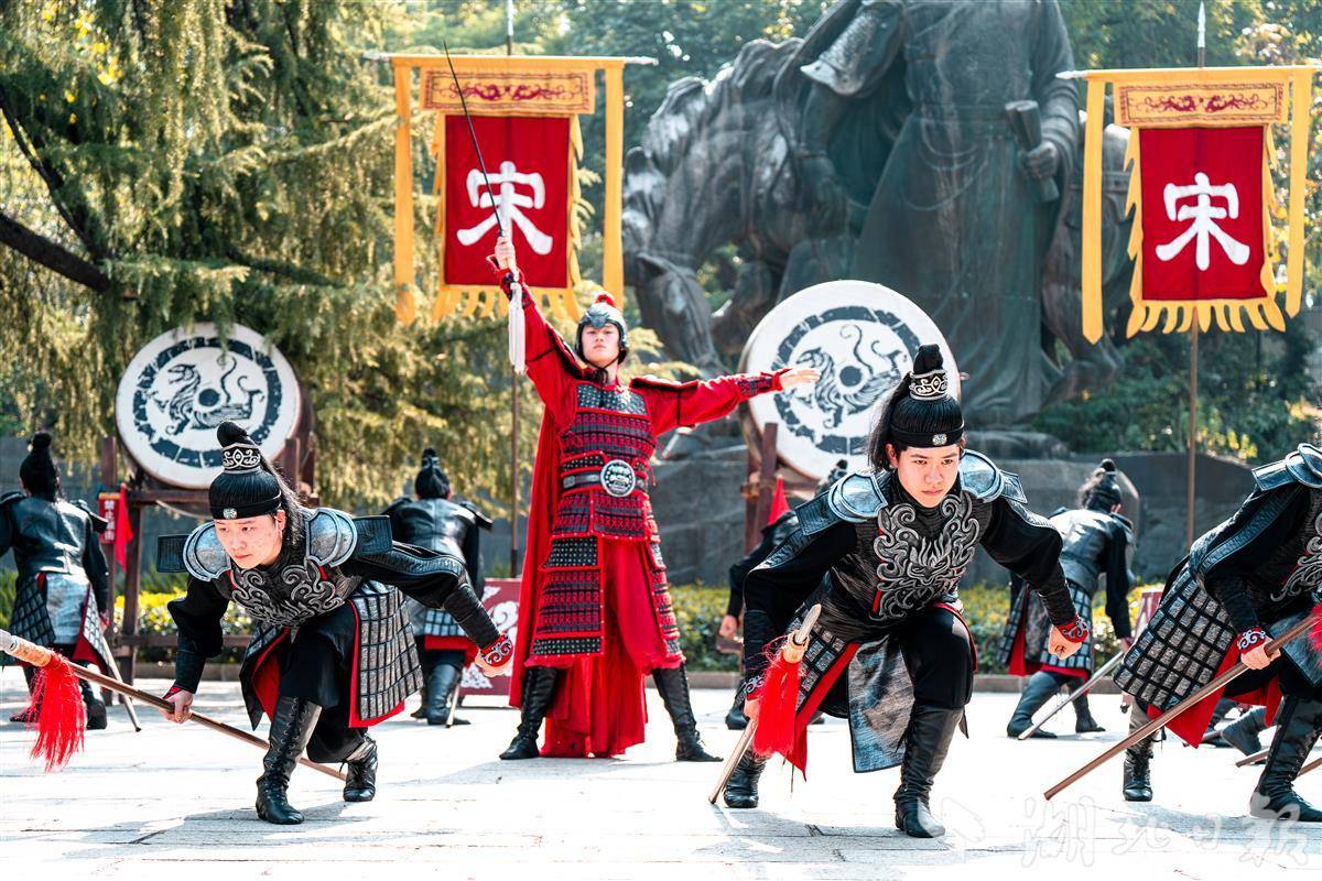 在主楼前西区广场,《凤舞九天》大型乐舞每天四场,舞者衣袂飘飘如凤凰振翅,红绸翻飞间,与黄鹤楼飞檐斗拱相映成趣;以鹅池为天然画幕,《清风弄墨》的舞者化身“水墨精灵”,现场水墨意境氤氲,仿佛一幅流动的古画在池畔徐徐铺展;激昂鼓点中,岳飞广场的《精忠报国》气势如虹,舞者身姿刚劲如岳家军将士,挥臂、踢腿间力量感十足,家国情怀悄然升腾;搁笔亭里,《唐乐》与《梦回太白》的乐声、诗声交织,古与今的对话在此自然发生……