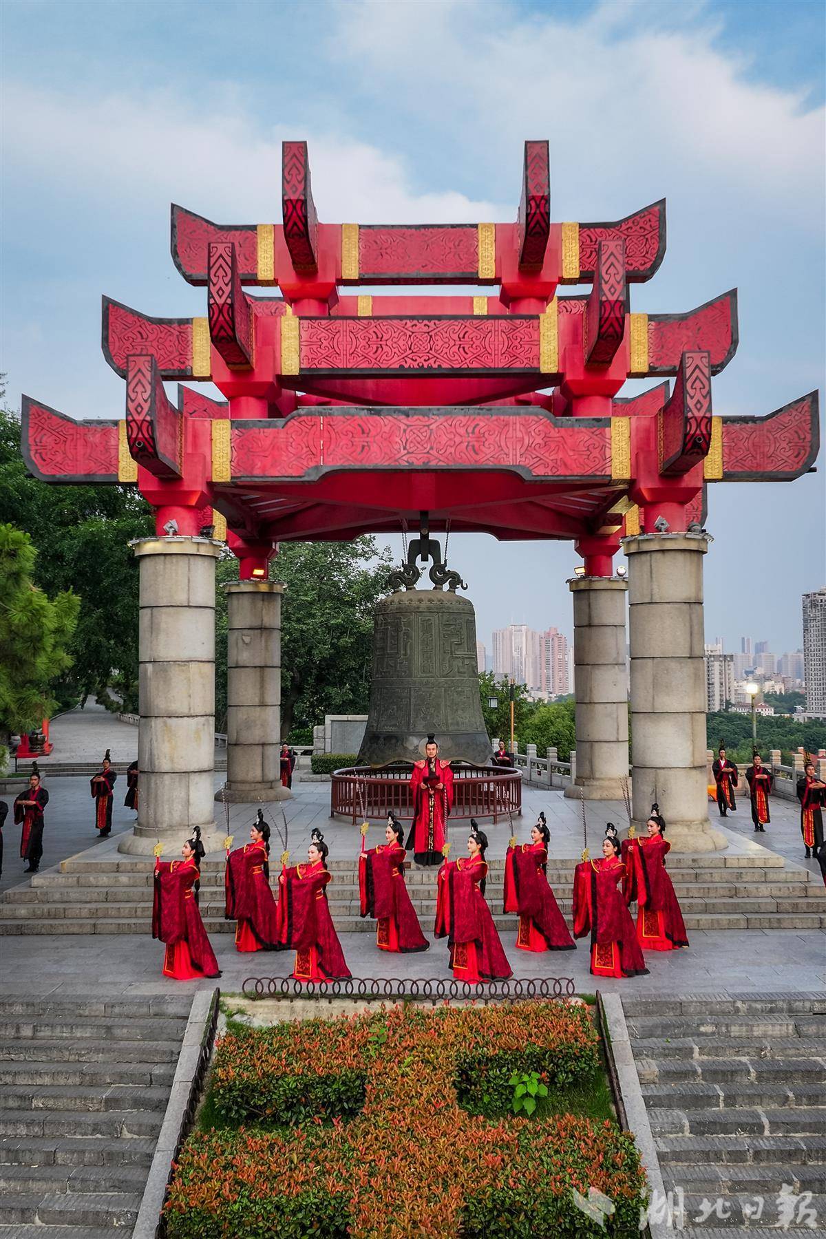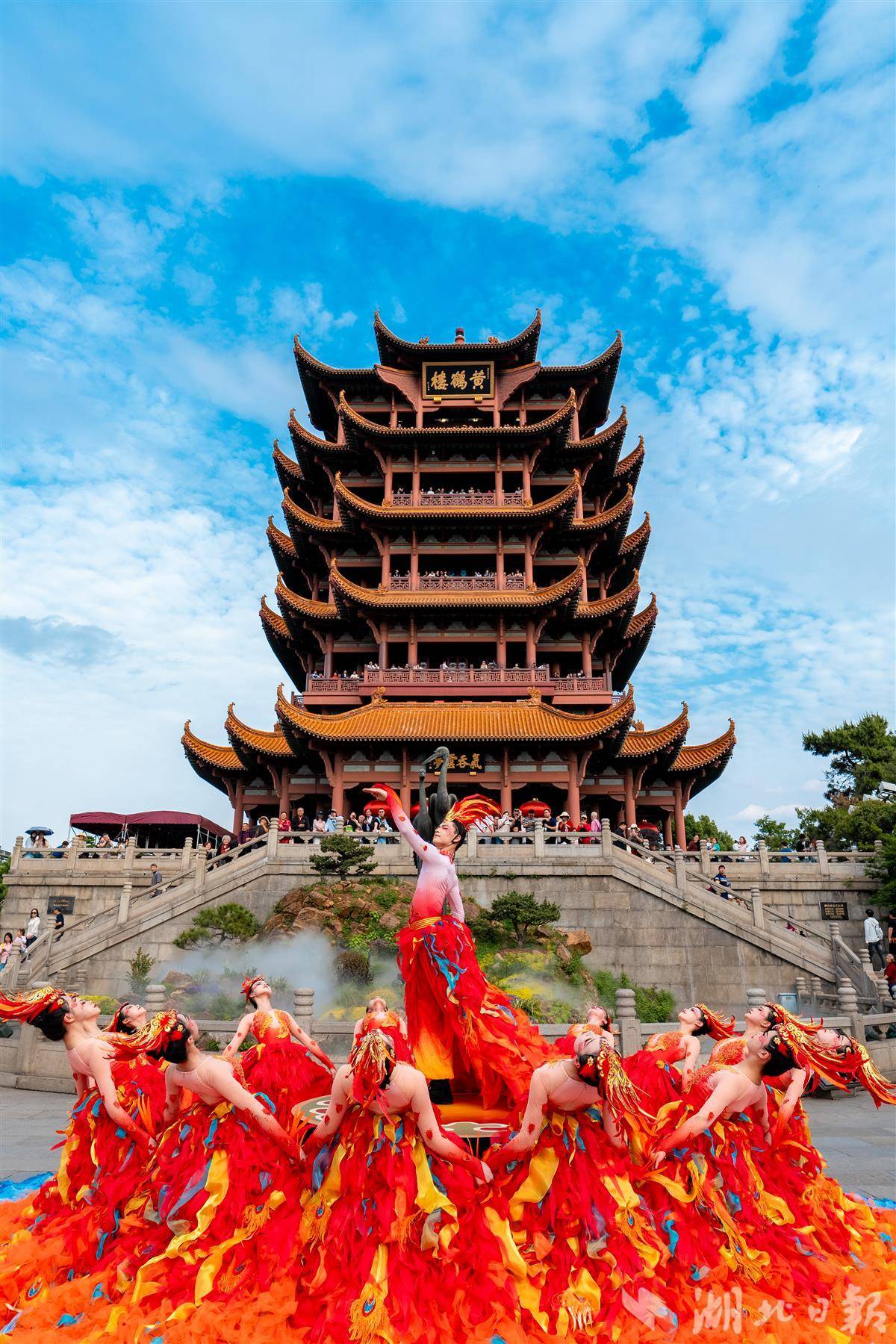 今年以来,黄鹤楼以“场景 + 演艺”的方式,黄鹤楼创新推出多场文艺演出。“五一”期间,春晚同款风格《凤舞九天》凤凰舞引发游客热烈反响;端午佳节里,《鸣钟祈福礼》以一场庄重的礼官表演与灵动的楚舞演出屡获好评;七夕当天,《黄鹤楼中吹玉笛》器乐演出在主楼推出,再现李白诗中的绝美意境。