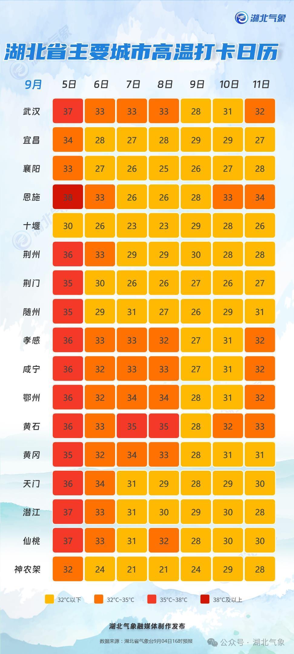 湖北气象部门预计,就在这个双休日,风雨合作,周六大部地区高温会被拍熄火,周日湖北各地均告别高温。