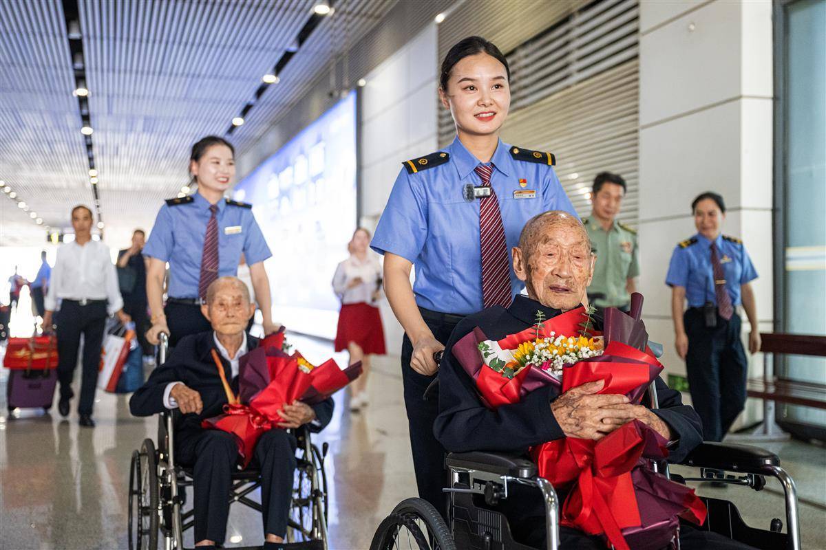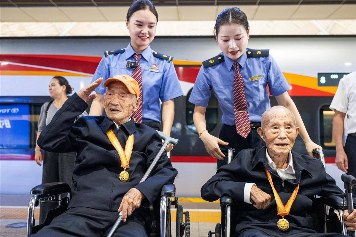 9月4日下午,在京参加纪念中国人民抗日战争暨世界反法西斯战争胜利80周年大会的抗战老兵代表宋其祥和刘吉祥乘高铁返回湖北武汉。