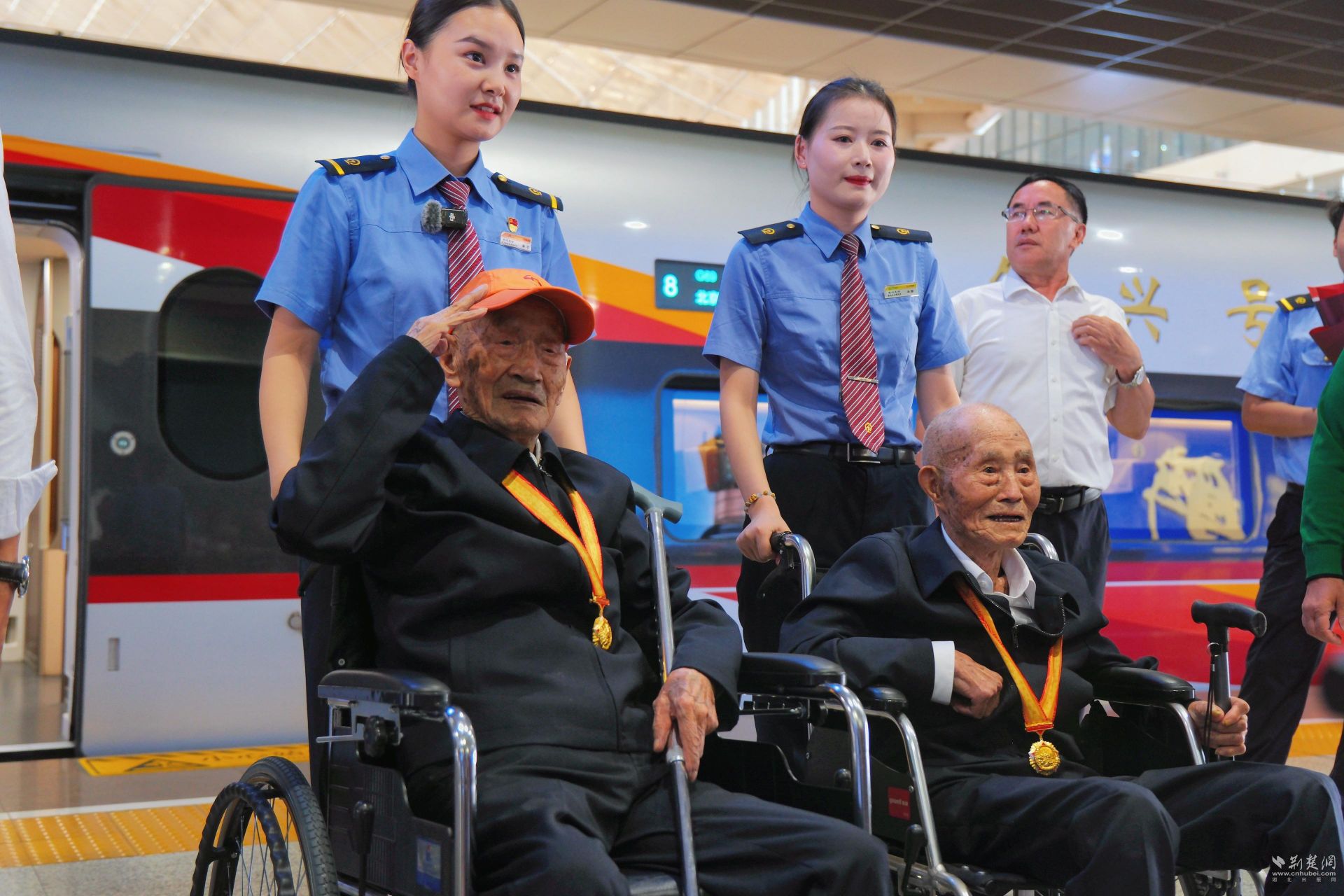 两位百岁抗战老英雄宋其祥、刘吉祥从列车中缓缓走出,胸前戴着闪亮的“中国人民抗日战争胜利80周年”纪念章。宋其祥老英雄主动向接站人员们敬礼致意。
