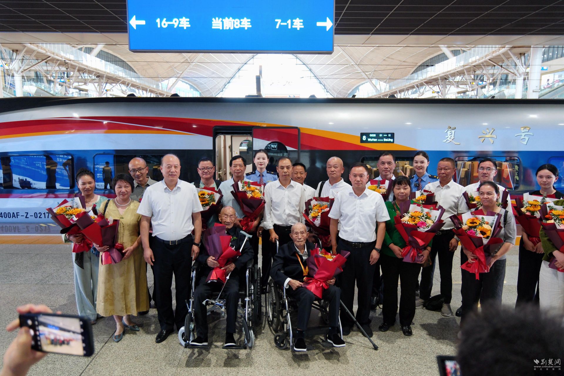 荆楚网(湖北日报网)讯(记者肖慧婷 实习生张书锦 通讯员陈凯 罗明)9月4日下午,随着复兴号列车驶入站台,赴京参加纪念抗战胜利80周年大会的抗战老兵代表、烈士遗属、退役军人代表顺利抵达武汉。省退役军人事务厅负责人到场欢迎并送上鲜花。