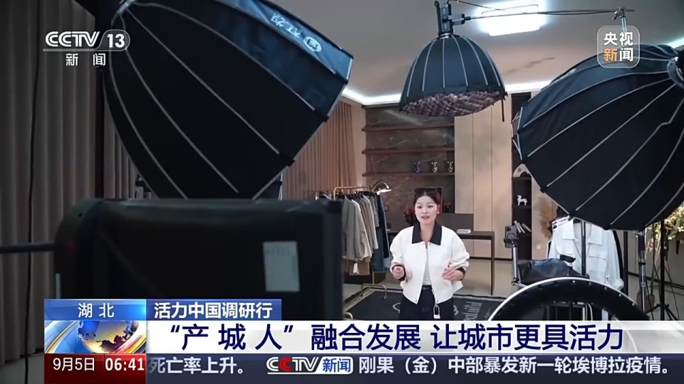 总台央视记者 金晓曦:在天门,夜晚热闹的不只是北湖夜市,还有产业园里的服装电商直播间。此时此刻,我身后的这8个房间里边同时开启了网上直播,平均每天都能售出6000多件服装。