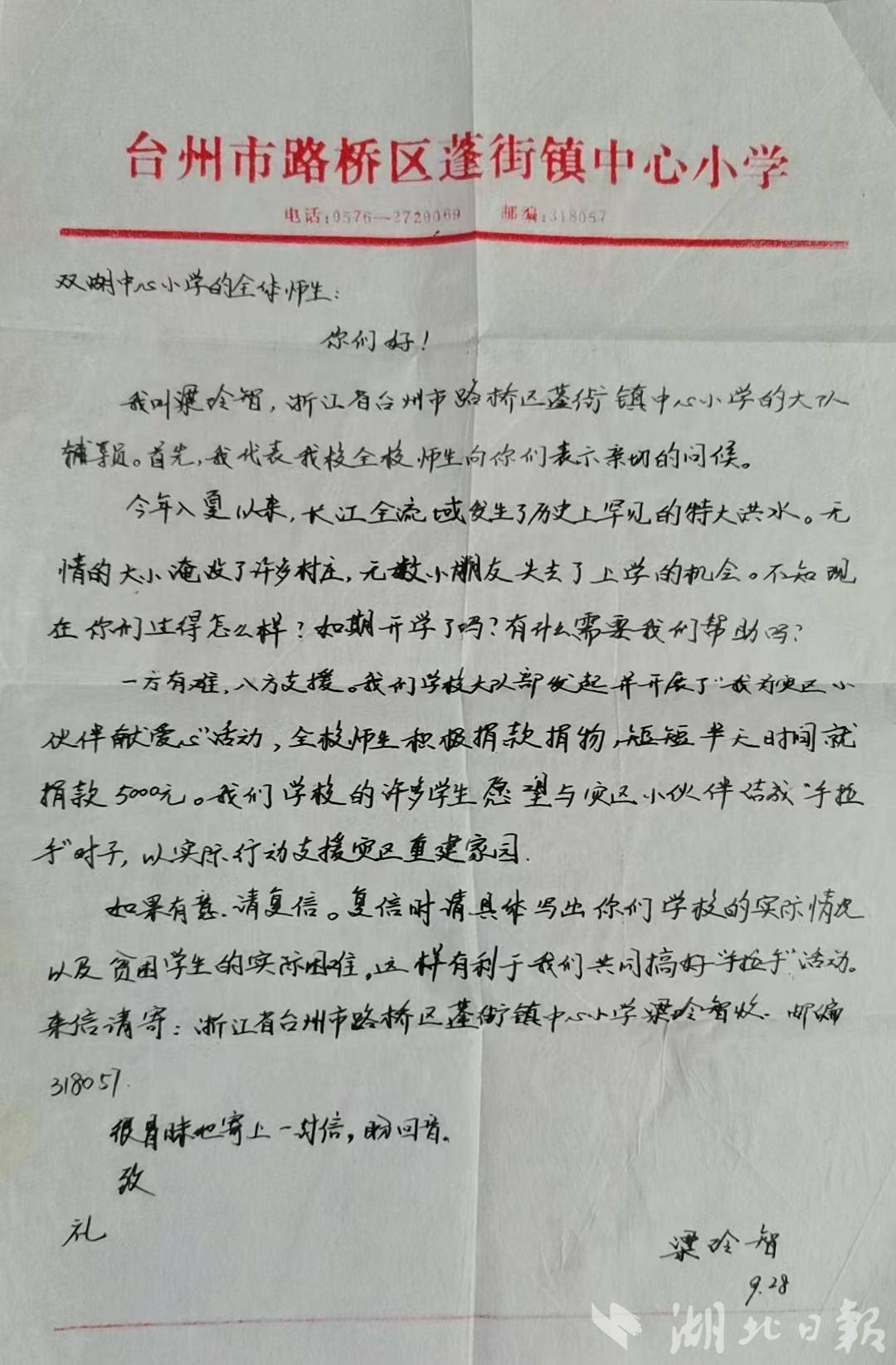 湖北日报讯(记者刘申、通讯员王文初、毛顺源)“在您身上,我们看到了中国人骨子里的家国情怀和手足情深。”浙江台州市路桥区路北小学教师梁玲智近日收到一封来自湖北公安县的感谢信,揭开了一段跨越27年的暖心故事。