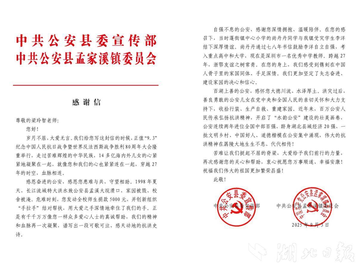 这场跨越二十七年的回响,不仅是一段个人善举的佳话,灾难中来自四面八方的大爱,更是当地重建家园的强大精神力量。公安县在感谢信中表示,如今公安已实现全面发展,连续跻身全国中部百强县、湖北县域经济20强,正在绘就“水韵公安”新画卷,抗洪精神在这片土地上传承不息。