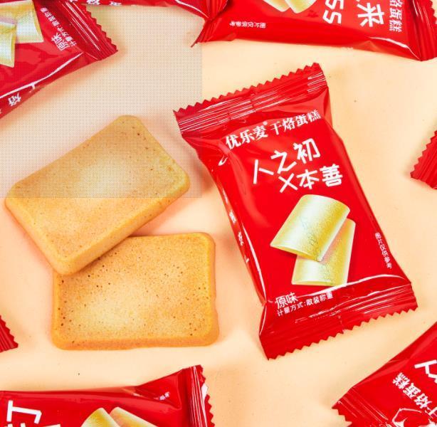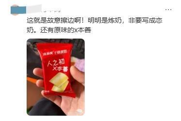 该网友展示了优乐麦食品的一款红色包装干烙蛋糕,上面醒目写着“人之初X本善”。该网友称,“人之初性本善”出自三字经,刻意将“性”改成“X”,就是故意引人联想男女关系。有人在评论区表示,优乐麦的这款原味干烙蛋糕味道其实很好,很多小朋友都爱吃,但是看到外包装的文字总感觉怪怪的。