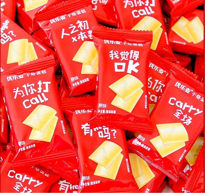 极目新闻记者搜索发现,在多个网购平台上,都有优乐麦食品这款产品在销售,有商铺仅这一款商品,就销售过超1000单。商铺展示的图片显示,优乐麦这款干烙蛋糕还有多种不同版本的创意文字,如“约吗”“胜利与小乔”“来服来diss”“carry全场”“有ferrstyle吗”“我觉得OK”等。