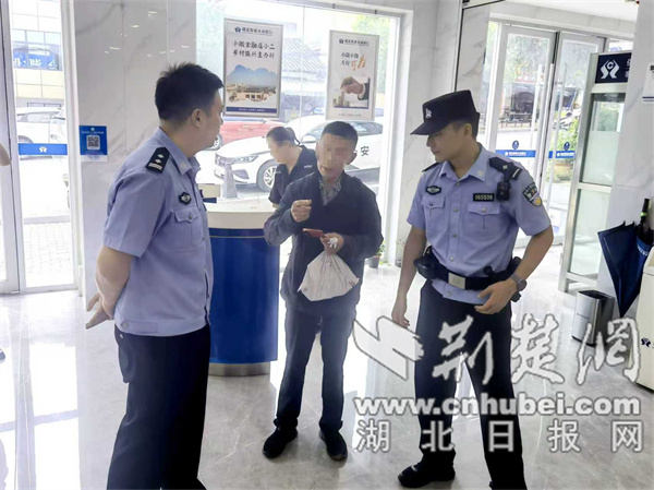 民警陪王大伯在银行存完钱。通讯员供图