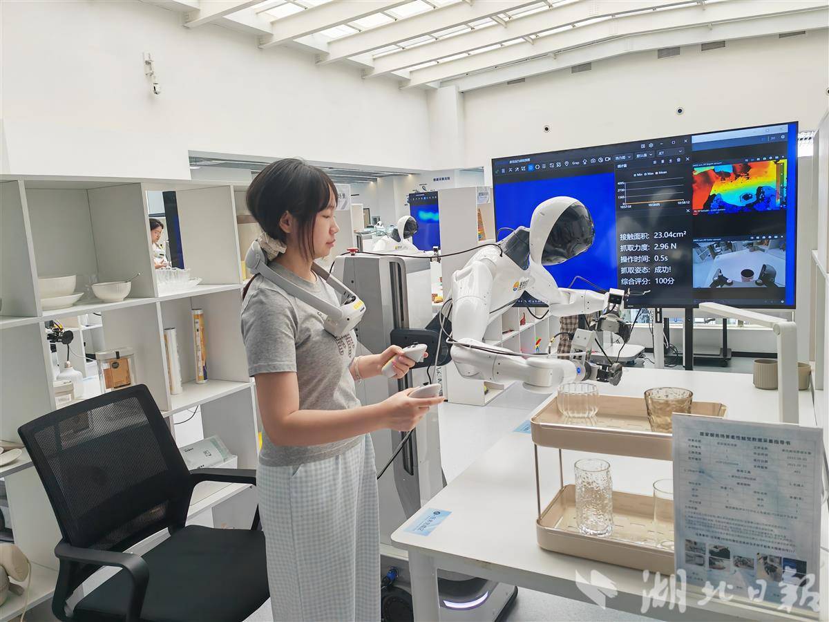湖北日报全媒记者在训练中心看到,机器人训练师通过高精度触觉动作捕捉设备,抓取茶杯、面包等各类物体,机器人同步学习,实现从感知、理解到预测、应用的全链路训练。