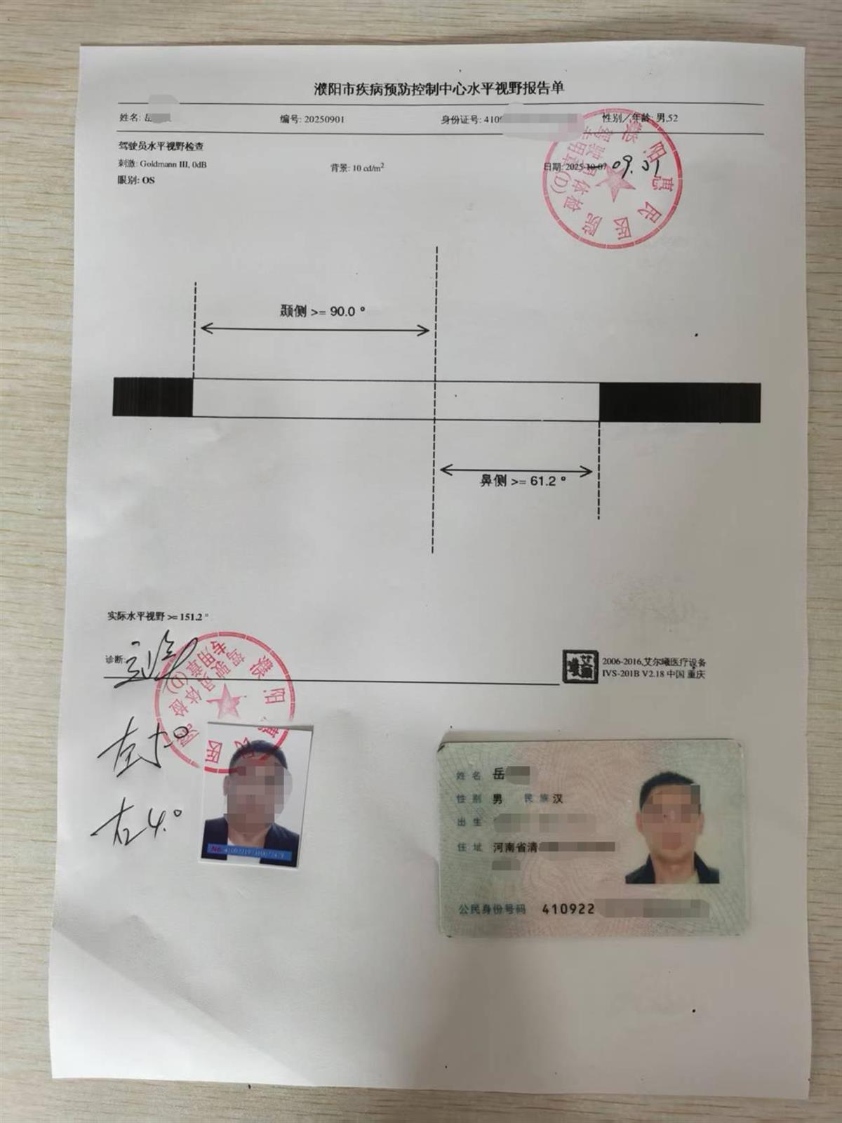 9月4日,河南濮阳市民曹先生致电极目新闻,实名举报52岁的岳某视力二级残疾,达到了“盲”的程度,却办到了长期驾驶证,因此对公共安全感到担忧。