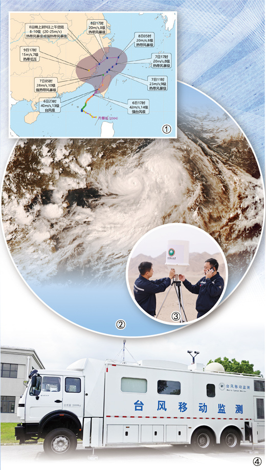 图①:今年第4号台风“丹娜丝”未来72小时路径概率预报图,2025年7月6日17时—9日17时(北京时)。 图②:台风“丹娜丝”4B静止卫星可见光云图,2025年7月6日17时(北京时)。 图③:为推进临空环境台风探测,科研人员在架设无线数据接收天线。 北京理工大学供图 图④:中国气象局上海台风研究所台风移动监测车。 图①②④均为中国气象局提供 |