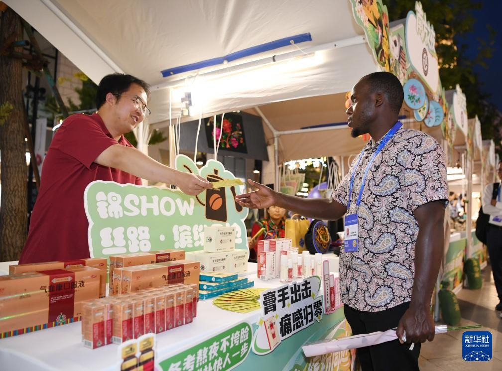 9月5日,“全球南方”媒体智库高端论坛代表(中)在“南方之夜”活动上与身着民族服饰的食品推介商户合影。