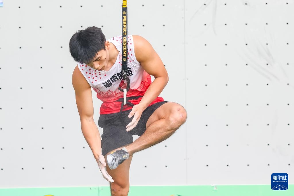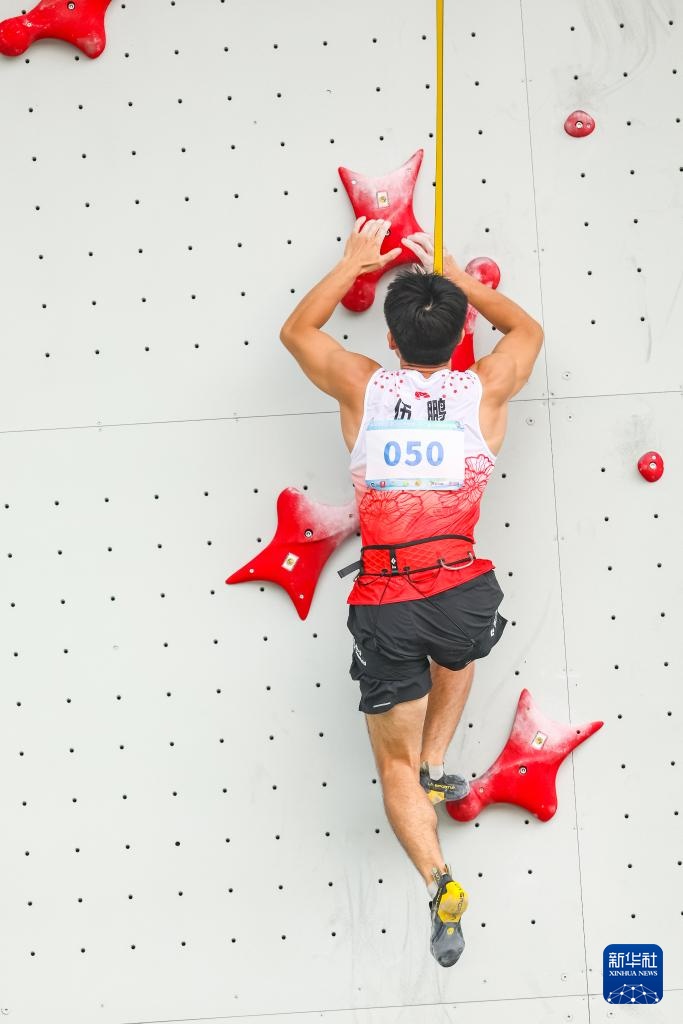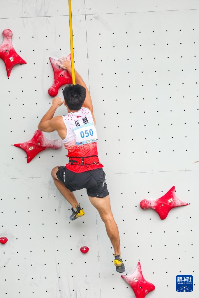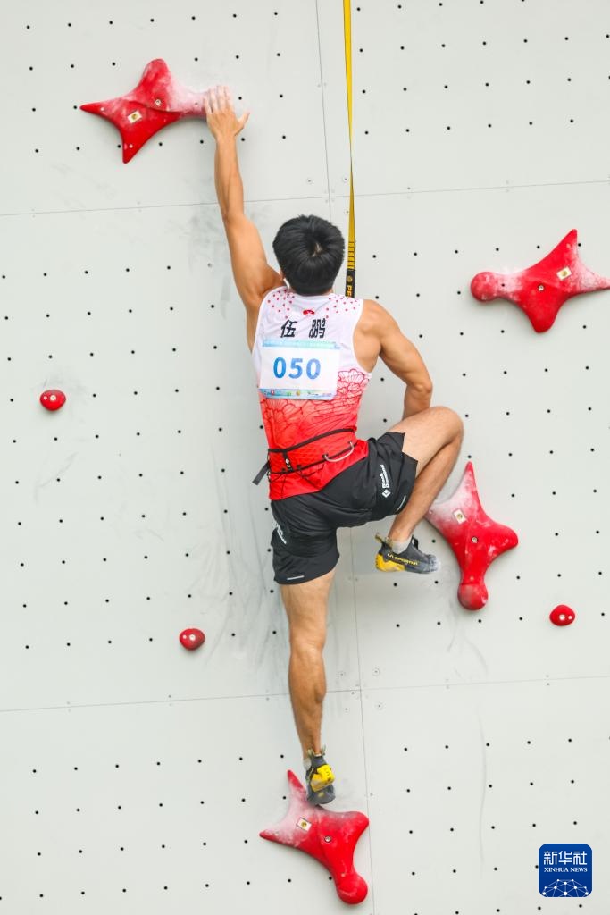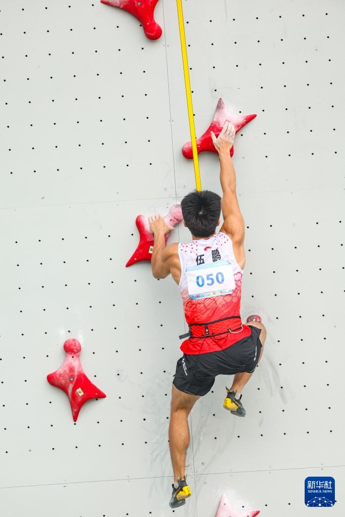 当日,在重庆举行的第32届全国攀岩锦标赛男子速度半决赛中,湖南队选手伍鹏以5秒67的成绩战胜广西队选手零勇志,晋级决赛。