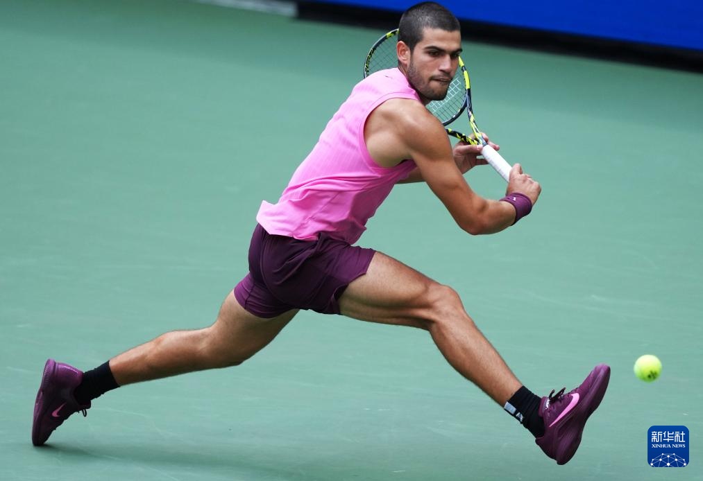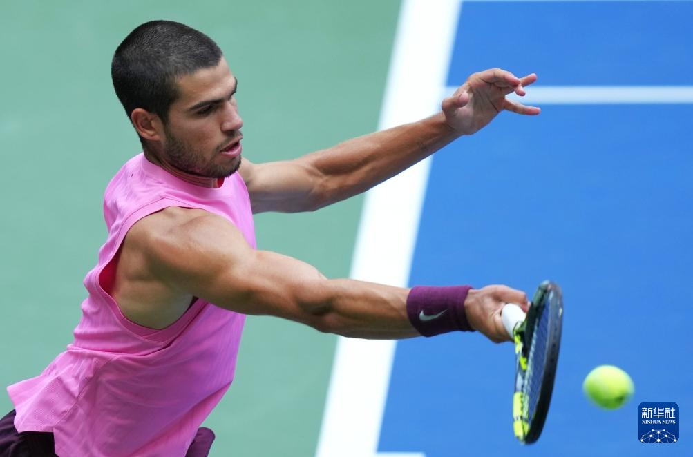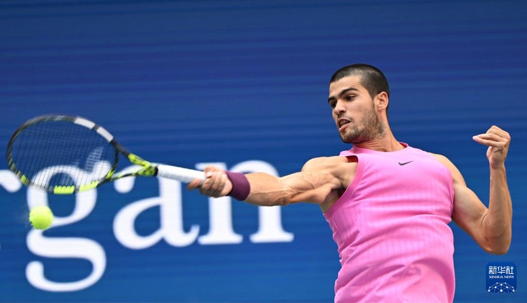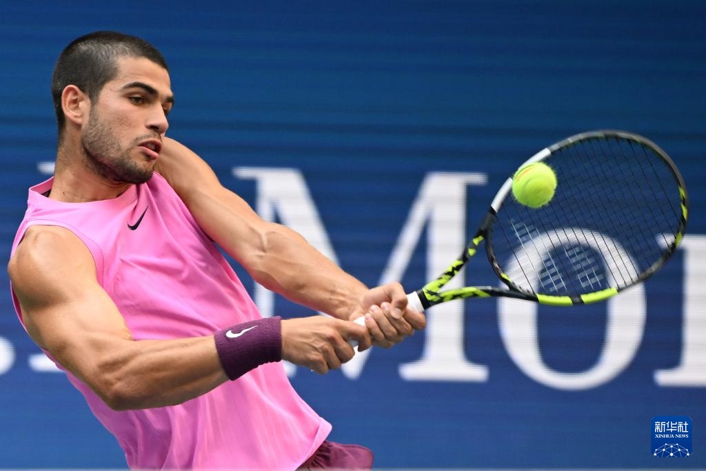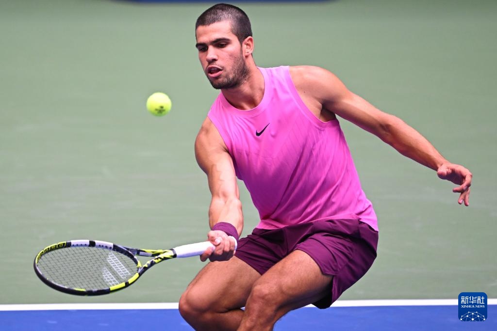 9月5日,阿尔卡拉斯在比赛中回球。