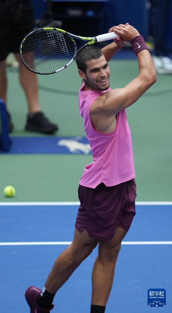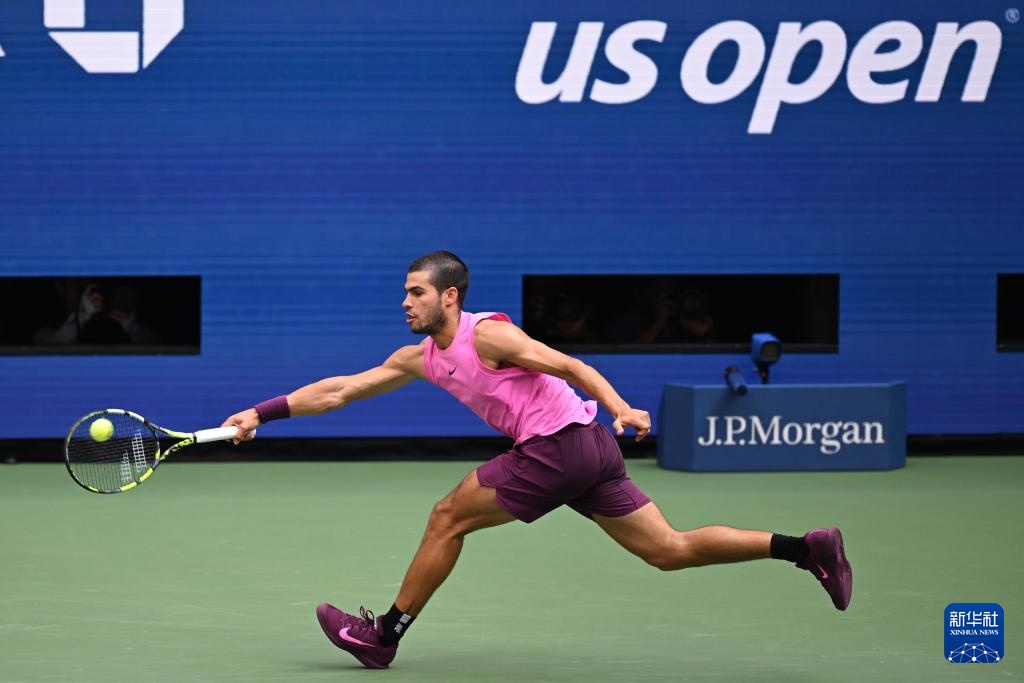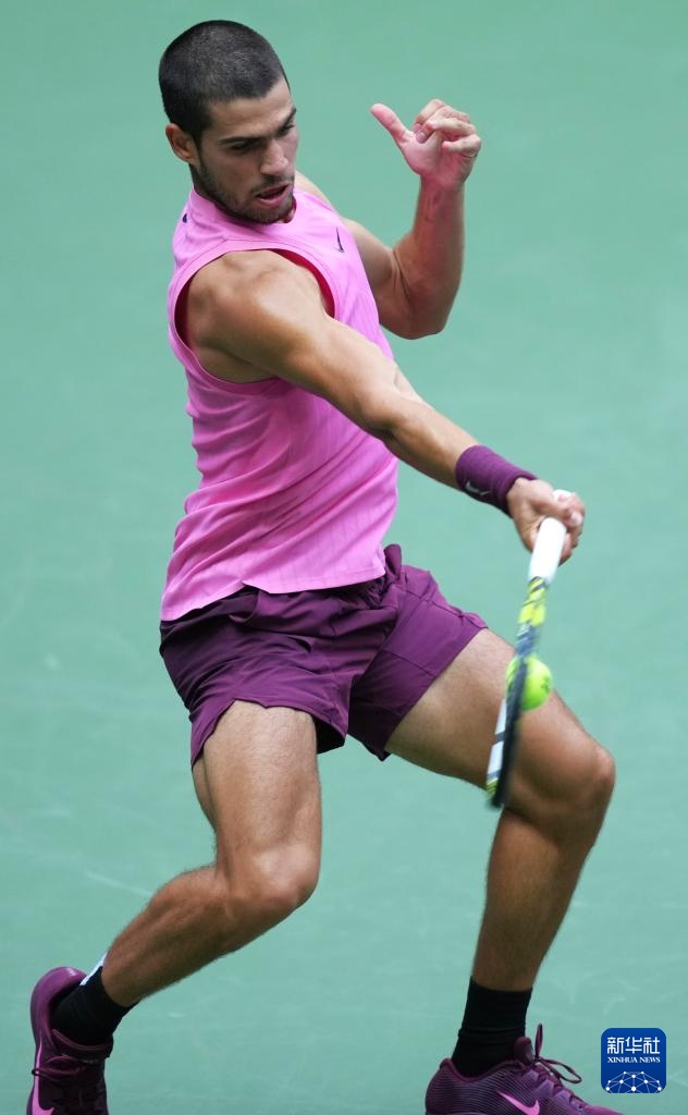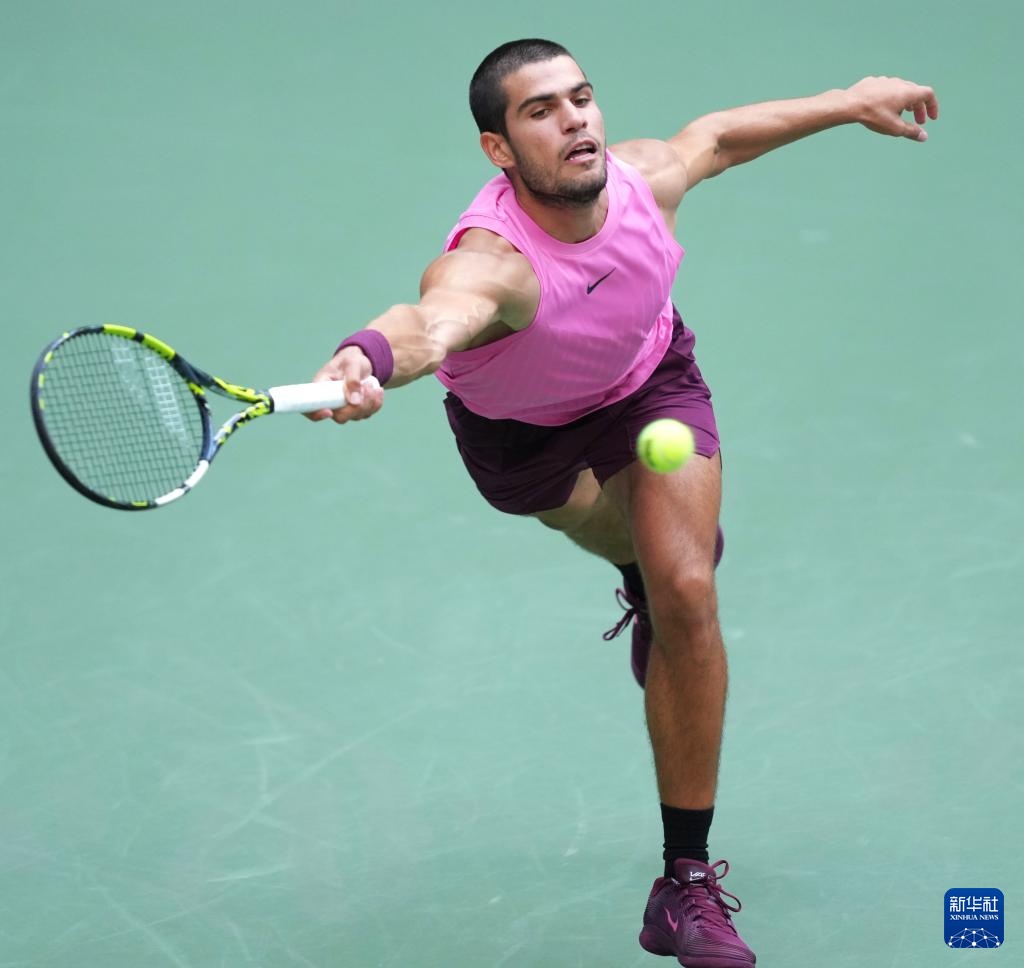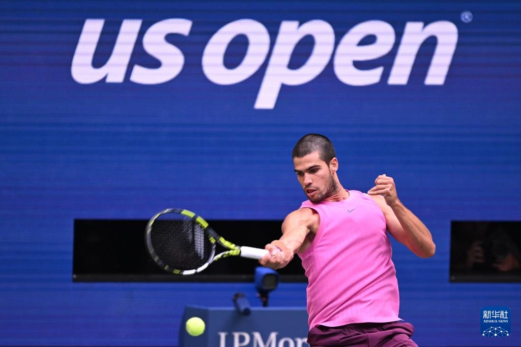 9月5日,阿尔卡拉斯在比赛中回球。