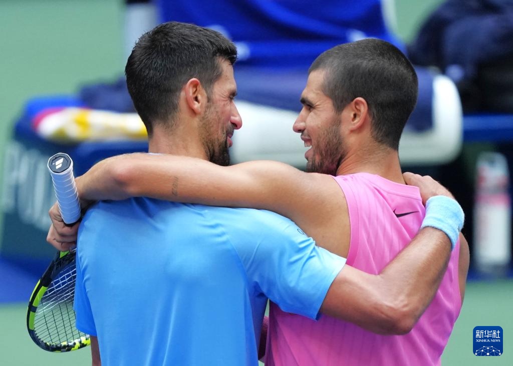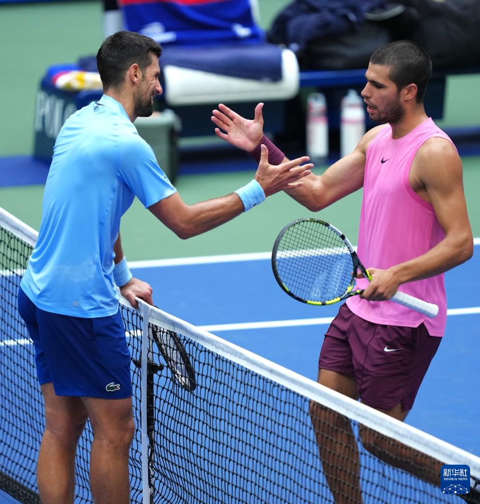 9月5日,阿尔卡拉斯(右)在比赛后与焦科维奇相互致意。