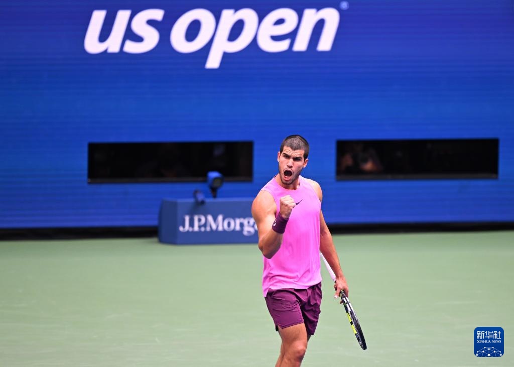 9月5日,阿尔卡拉斯在比赛中庆祝得分。