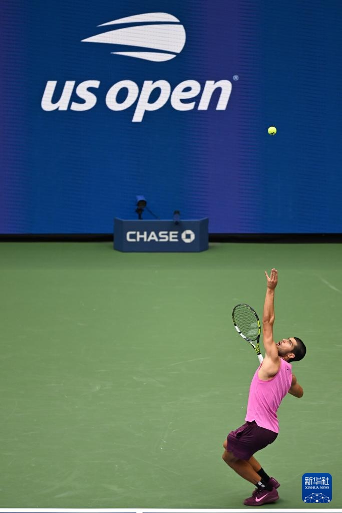 9月5日,阿尔卡拉斯在比赛中发球。