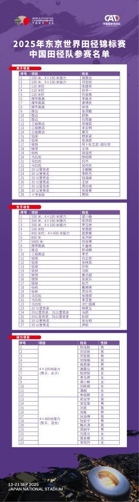 新华社北京9月6日电(记者吴俊宽、王沁鸥)2025年世界田径锦标赛将于9月13日至21日在日本东京举行。中国田协6日公布中国田径队参赛名单,其中既包括东京奥运会女子铅球冠军巩立姣、巴黎奥运会女子20公里竞走冠军杨家玉等名将,也有不少首次参赛的世锦赛“新兵”。