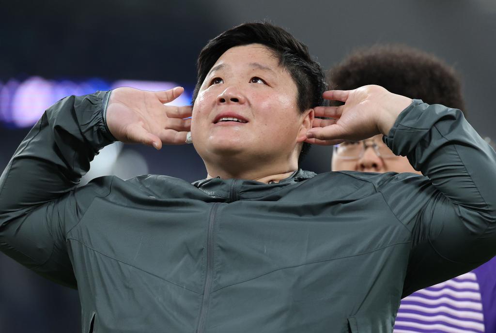4月26日,中国选手巩立姣(前)在2025世界田联钻石联赛厦门站女子铅球比赛前亮相。最终,她获得季军。新华社记者 李明 摄