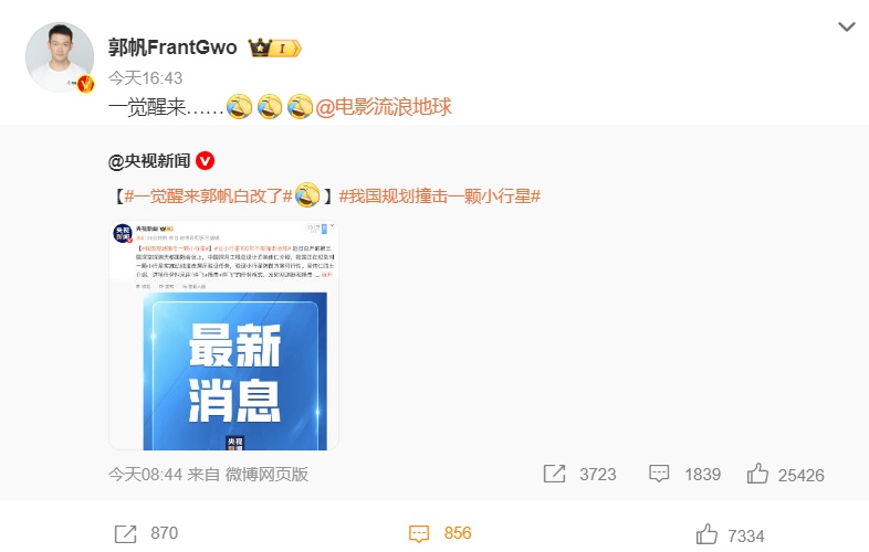郭帆发文回应央视新闻,“一觉醒来......”并在评论区回应:“两眼一黑又一黑……”