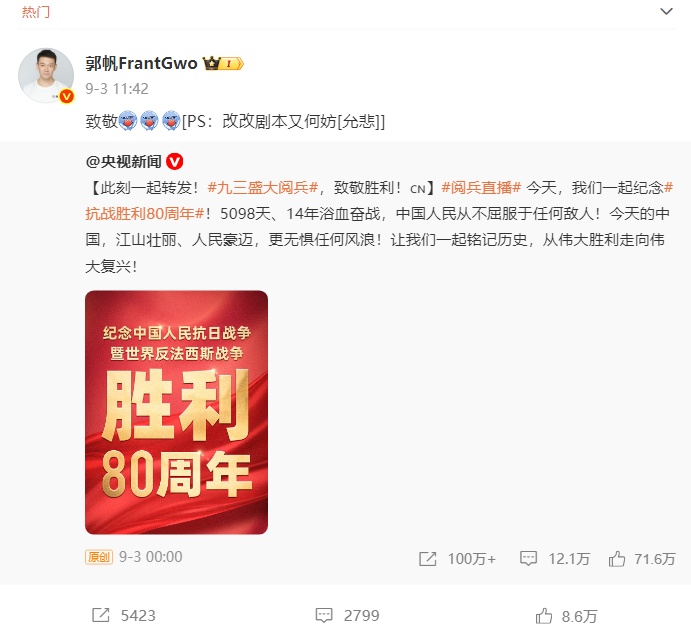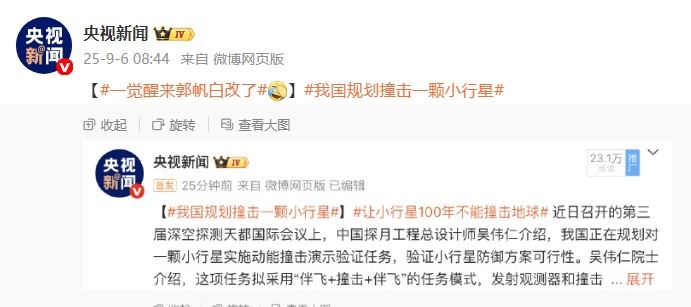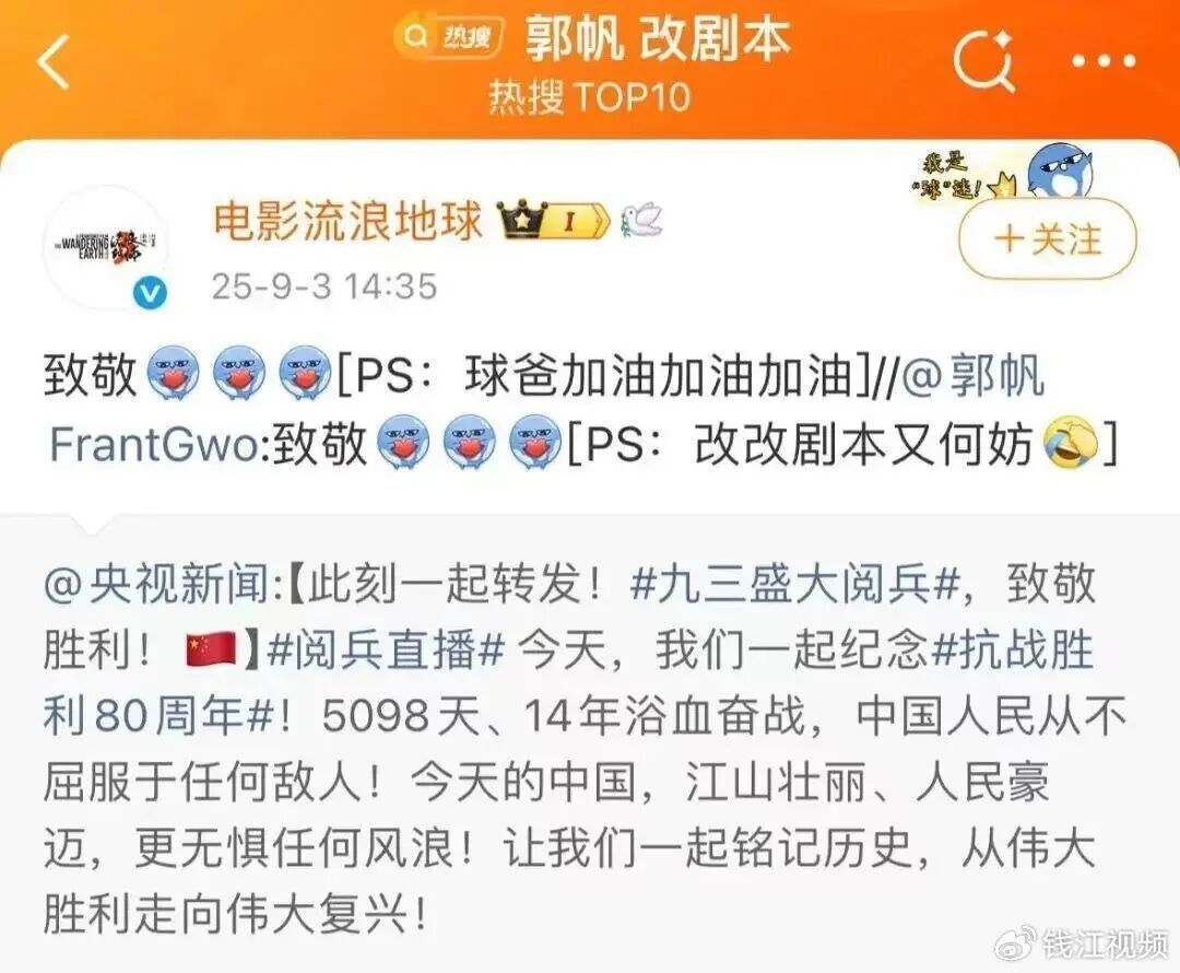 消息一出,引起网友集体关注。央视新闻微博还带上#一觉醒来郭帆白改了#的话题。