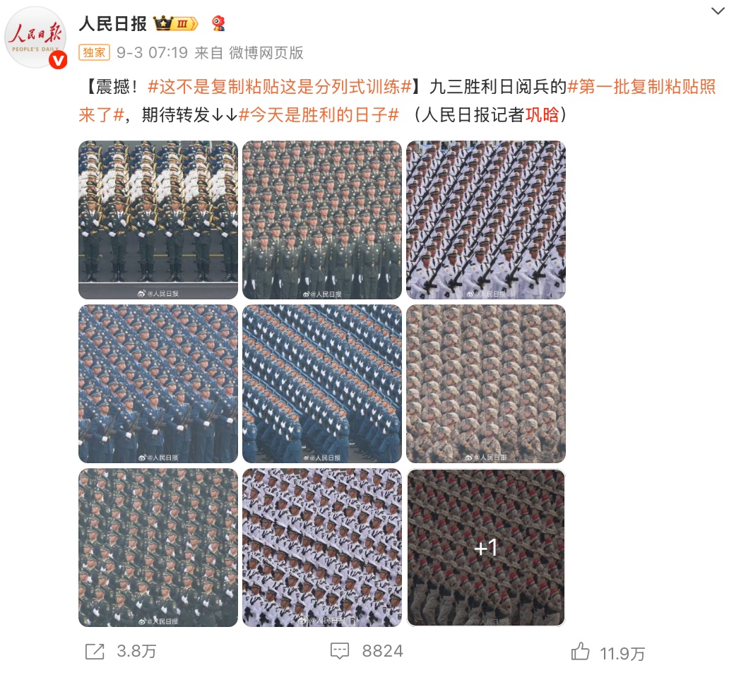 就在阅兵前一天——9月2日,我们在人民日报新媒体各端口推出中英日三语种主题片——《胜利!》,带大家回顾了80年前日本签署投降书的现场。我们希望在80年后仍有人试图淡化、否认历史的今天,用影像守护中华民族的集体记忆,让大家关注这场大阅兵,铭记属于中国人的胜利。