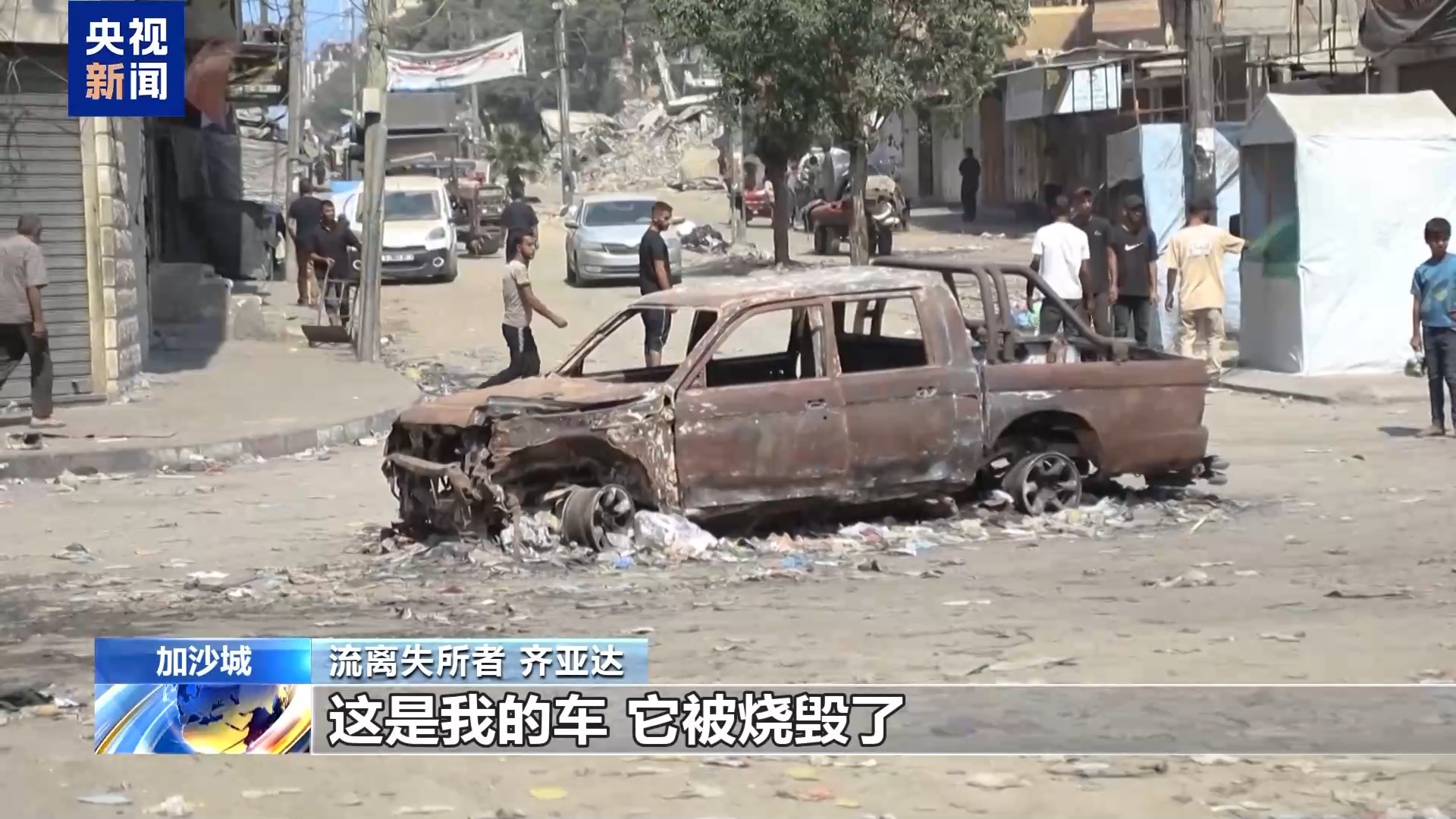 流离失所者 齐亚达:以军的无人机向汽车和人群密集地区投掷炸弹。这是我的车,它被烧毁了。这里的情况很可怕,我们之前侥幸逃过了四次袭击,这次我们想找到安全的地方。