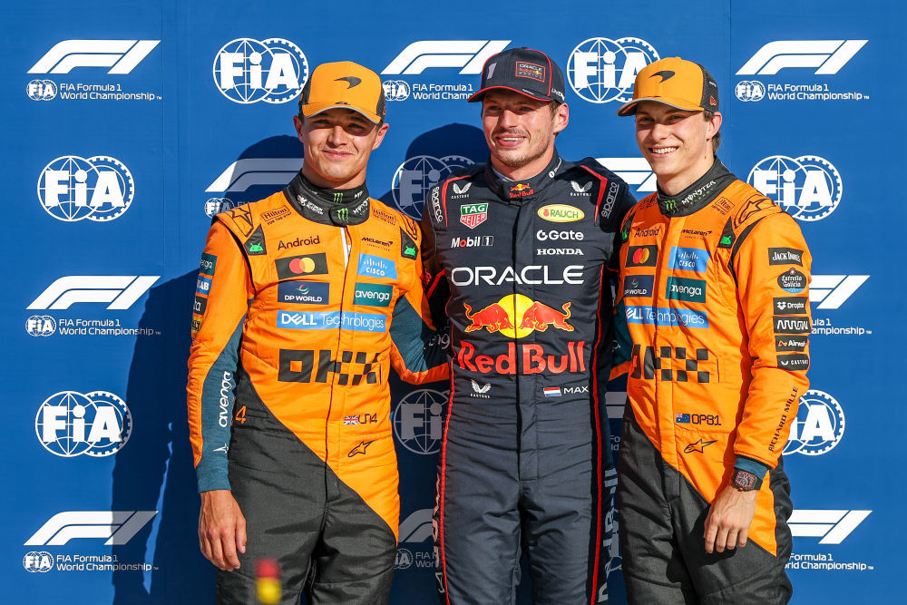 9月6日,获得杆位的红牛车队荷兰车手维斯塔潘(中)、第二名迈凯轮车队英国车手诺里斯(左)、第三名迈凯轮车队澳大利亚车手皮亚斯特里在赛后合影。当日,2025赛季世界一级方程式赛车锦标赛(F1)意大利大奖赛排位赛在意大利米兰附近的蒙扎赛道举行。新华社发(钱俊摄)