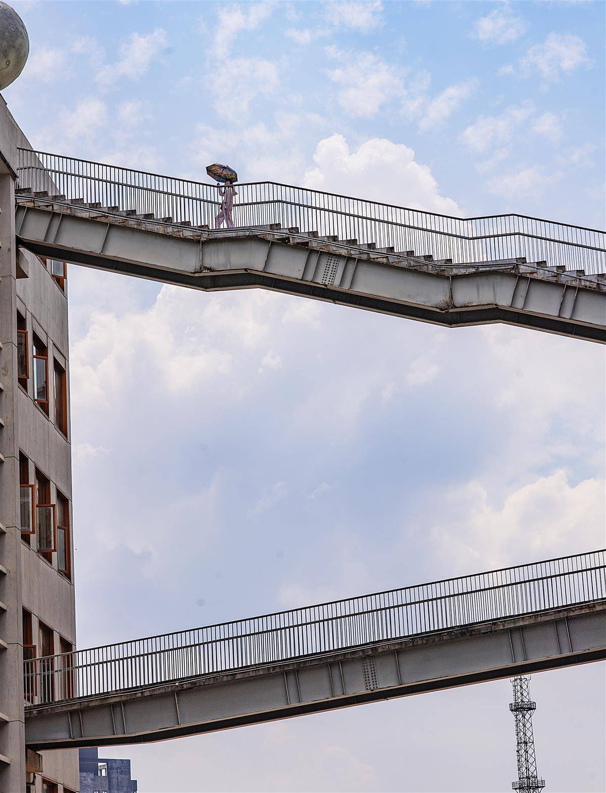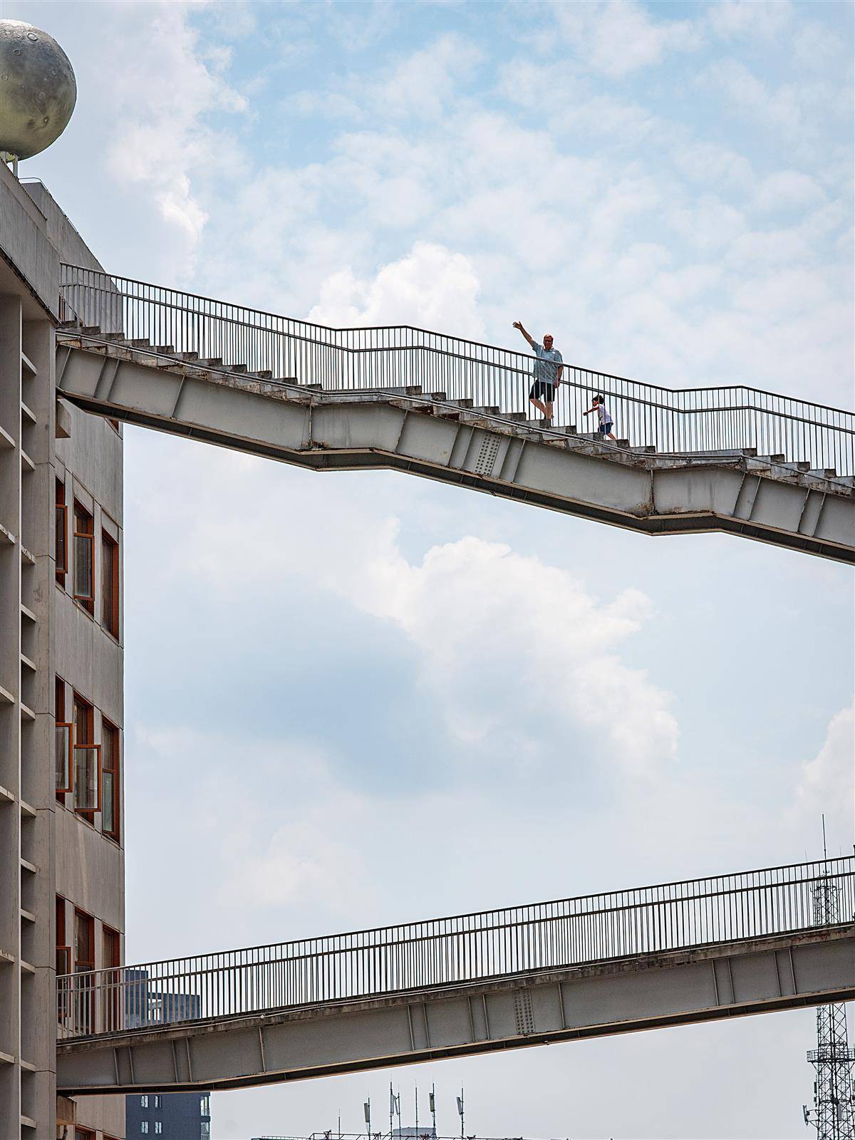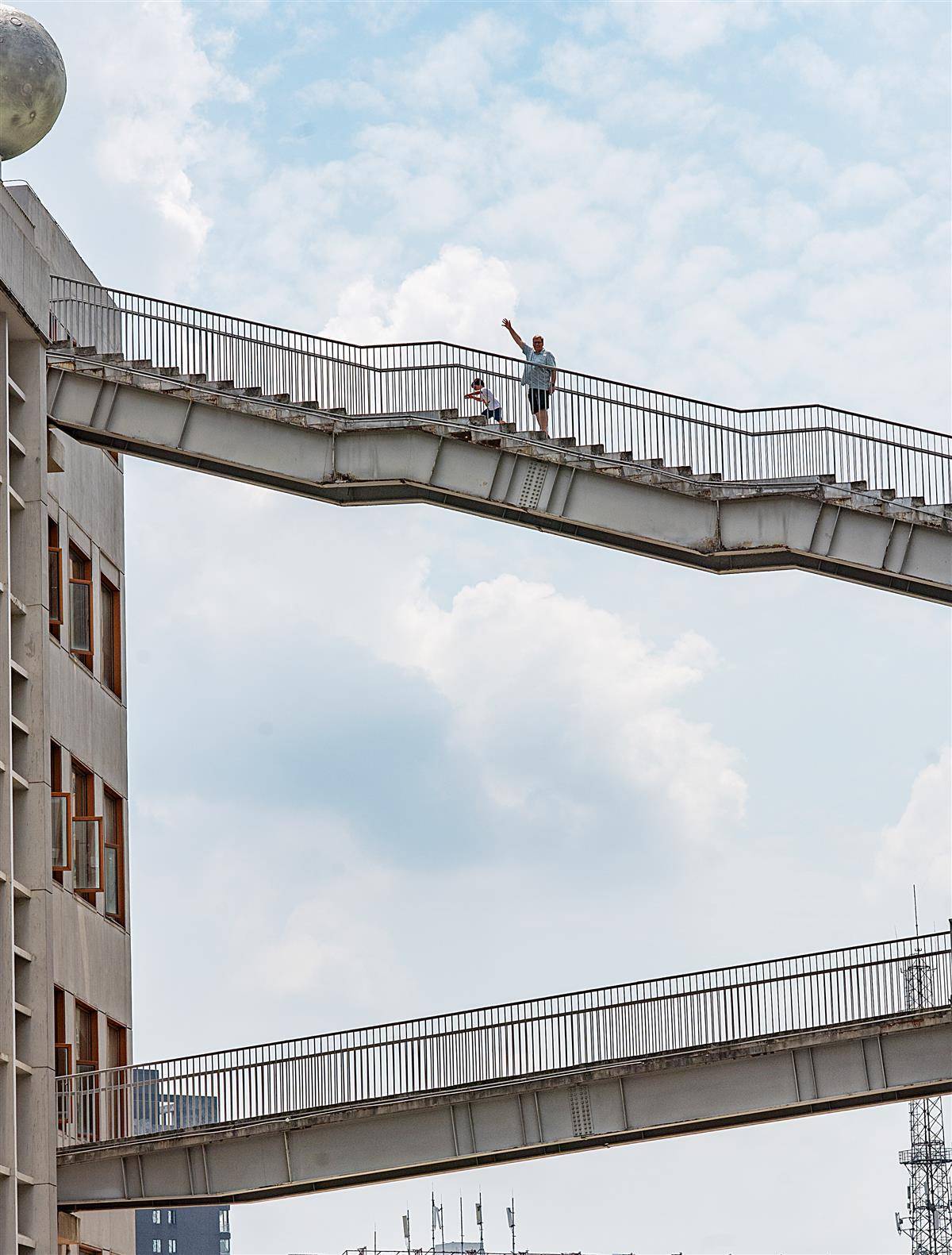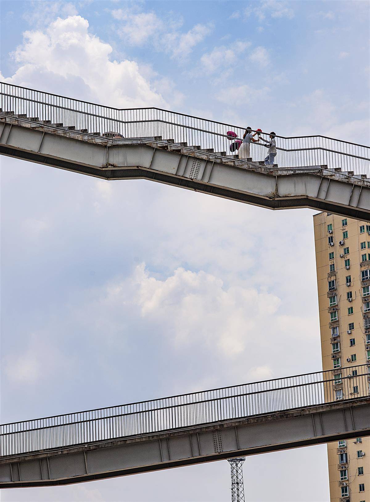 9月5日,武汉大智路无界空中小镇,许多青年男女行走在空中连廊上,仿佛走向云端。标志性的阶梯设计延伸至顶层,登顶后可拍摄“走向云端”的视觉效果。