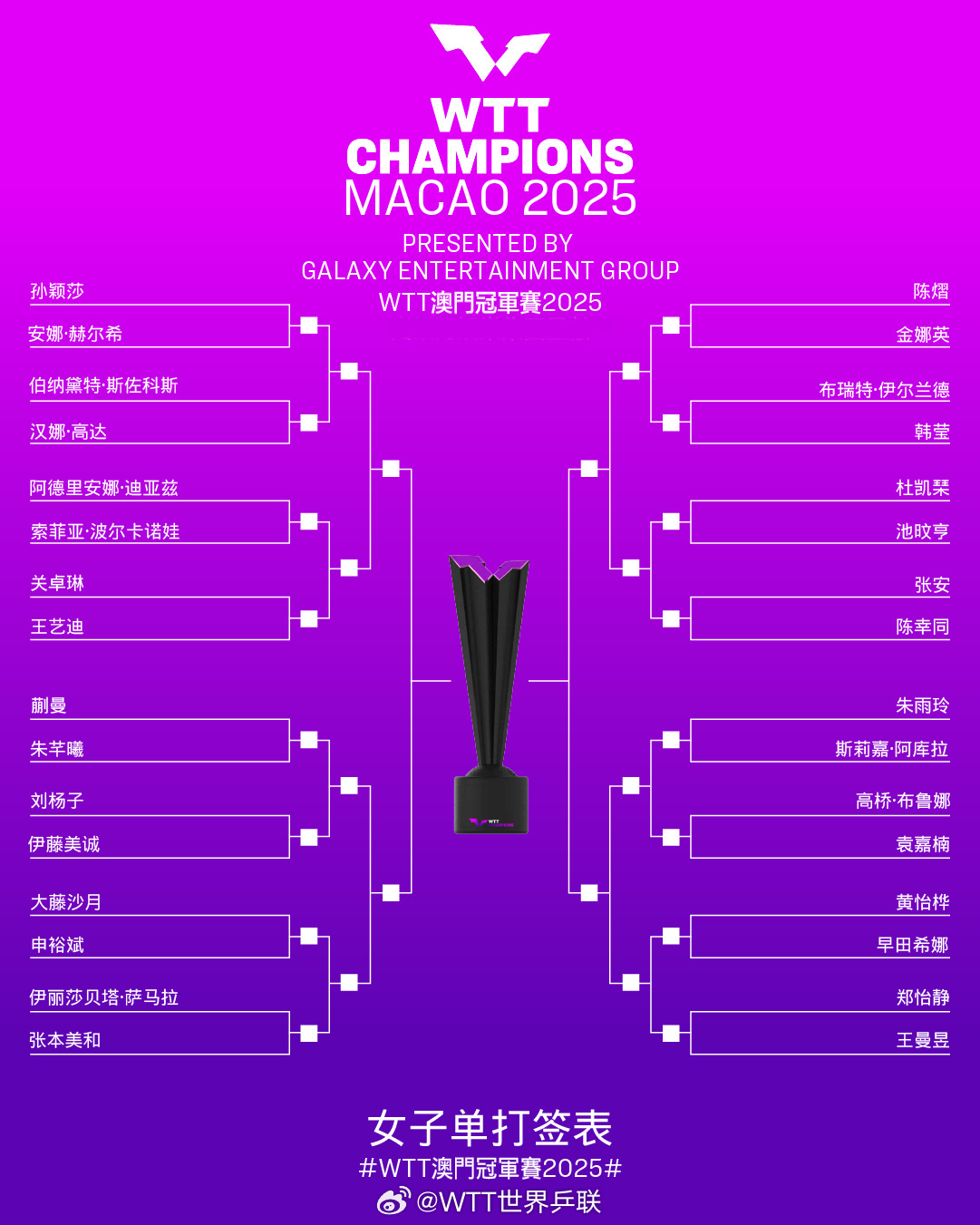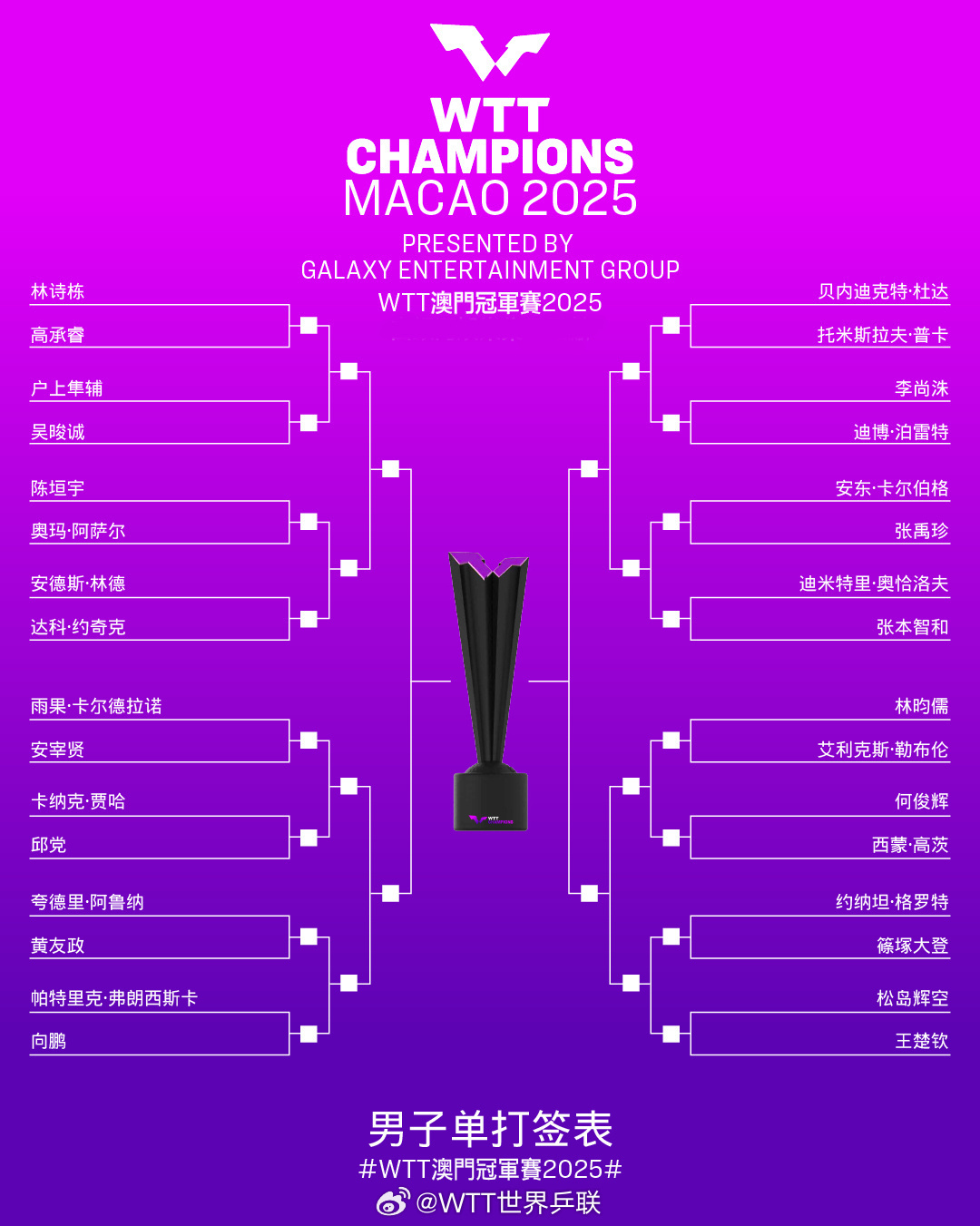 WTT澳门冠军赛男女单打签表出炉,国乒首轮对阵如下: