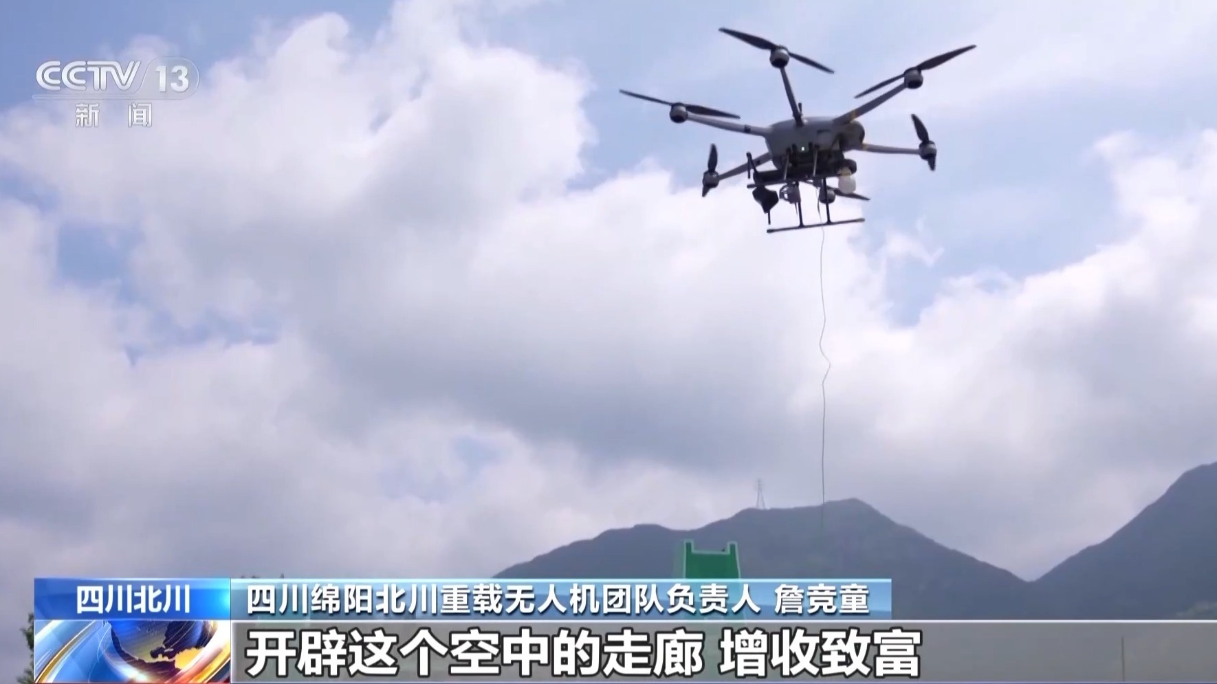 四川绵阳北川重载无人机团队负责人 詹竞童:我们在附近乡村培养了飞手,在北川这个区域,已累计培养了60多个本地飞手,现在不少老乡已经能够独立完成飞行作业。我们希望通过这种方式,让更多老乡能够靠着“空中的帮手”,开辟空中走廊,增收致富,把家乡的农产品更方便运出去。