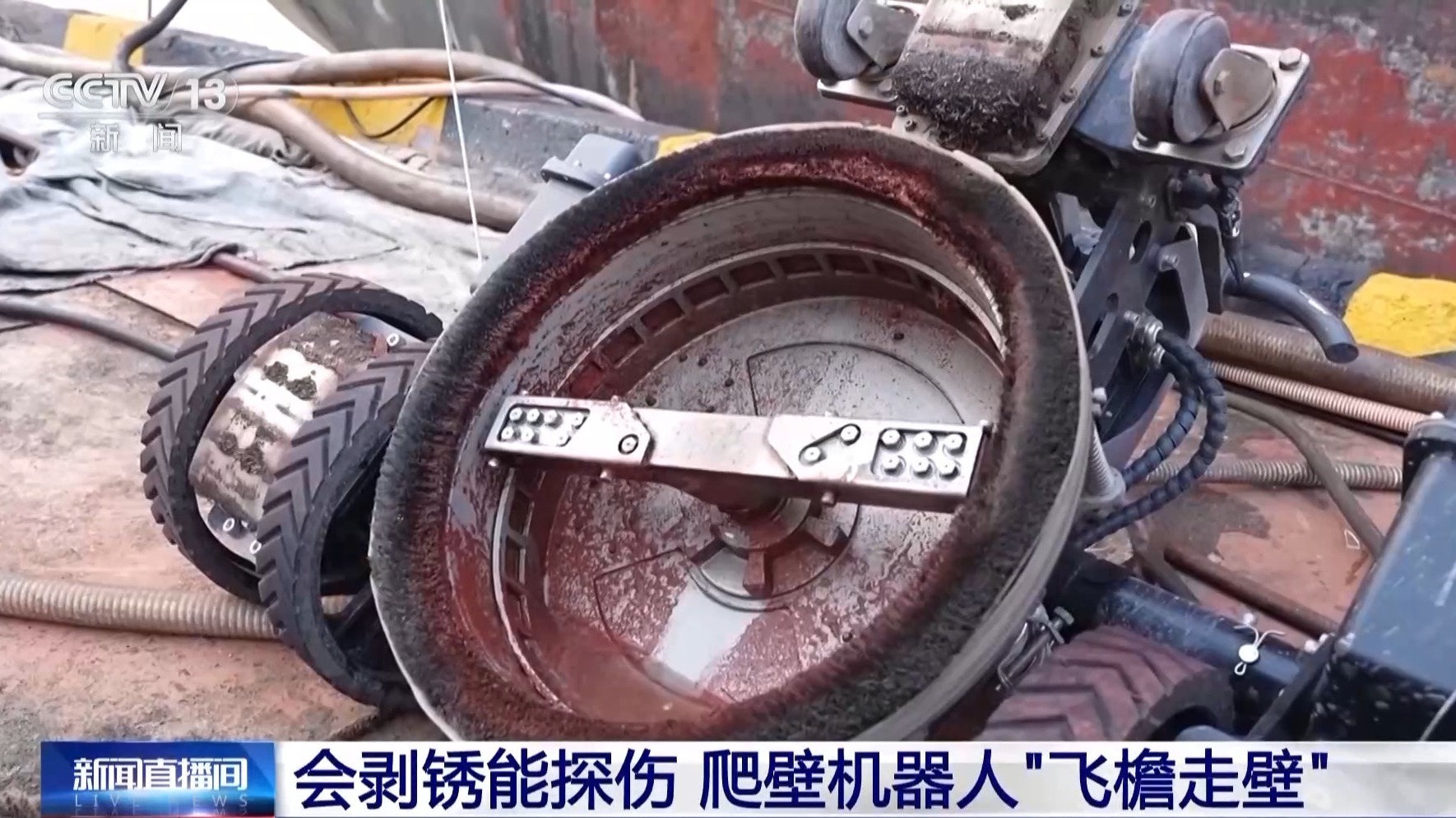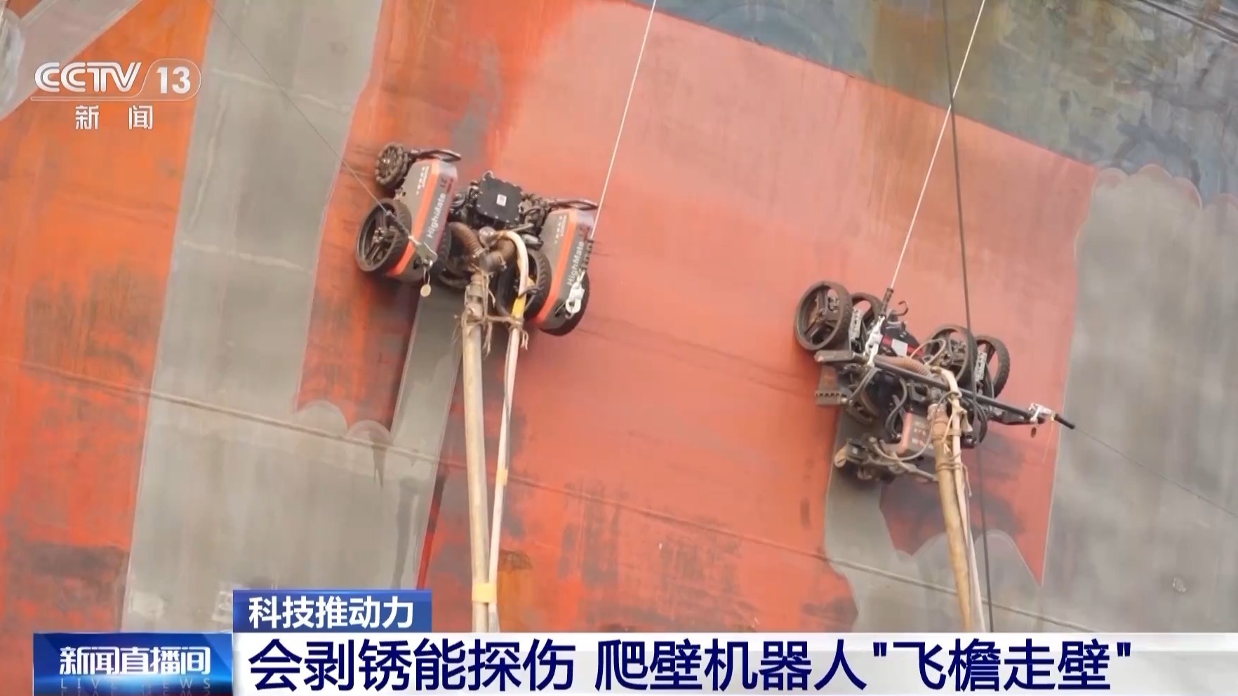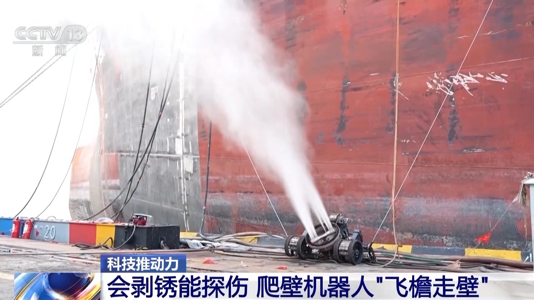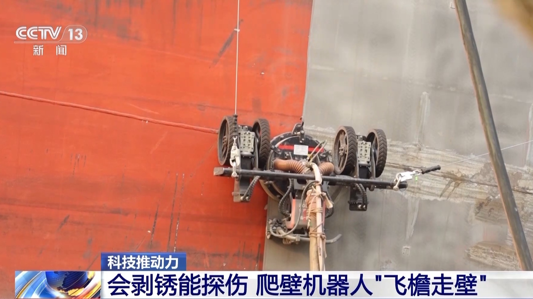 总台央视记者 古峻岭:传统的人工除锈作业需要工人站在升降机上,手持专业的除锈设备进行操作,费时费力,还存在一定的安全风险。可以看到这个机器人连接着一粗一细,两根长长的水管,细的是高压进水管,通过高压水流可以有效清除船体原来旧的涂层,可以看到原本锈迹斑斑的船体,锈迹已经被清理干干净净。它还有一根粗的水管,清理过后的废水和锈渣全都由这根粗管进行回收,集中处理,对作业环境非常友好。