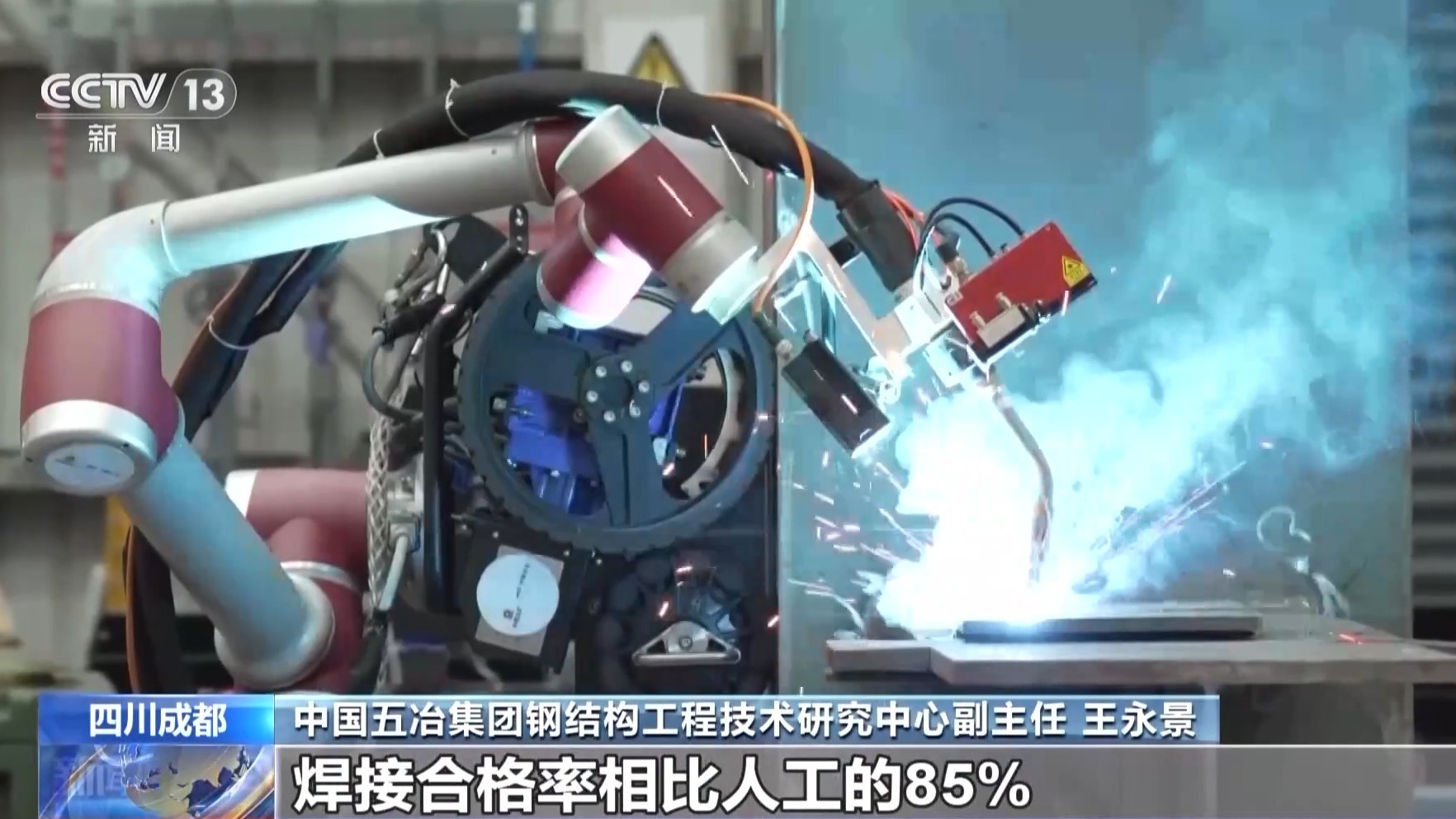 中国五冶集团钢结构工程技术研究中心副主任 王永景:它对肉眼难以察觉的焊接缺陷的识别率超过了95%。相比于人工,它的效率可以提升50%以上,焊接合格率相比人工的85%,提高到了98%。