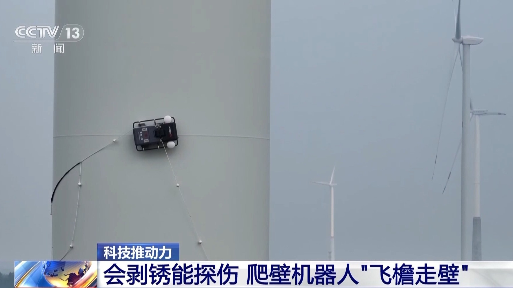 总台央视记者 古峻岭:这种爬壁机器人不仅在船舶除锈方面得心应手,在风电领域也同样大展身手。这个机器人就像一个巨型的蜘蛛,围绕着风电机组圆柱形的塔筒正在执行探伤检查作业。风电机组顶部近百吨重的主机舱和三根近百米长的叶片,所有的重量都压在塔筒上。不仅如此,塔筒还常年承受风吹日晒雨淋和强紫外线辐射等,时间长了会出现不同程度的老化。为确保万无一失,这个机器人采用电磁探伤技术,给塔筒做CT扫描,第一时间发现细小的裂缝等安全隐患。