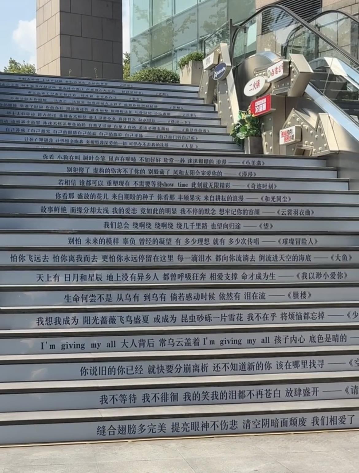 网友发布的视频中可以看到,该处台阶位于商场地下一层到通往地面的进出口,共有25级,每级台阶的侧面都写有一段周深歌曲的歌词,如《大鱼》的歌词“怕你飞远去/怕你离我而去/更怕你永远停留在这里/每一滴泪水/都向你流淌去/倒流进天空的海底”;《和光同尘》的歌词“你看那盛放的花儿/来自期盼的种子/你看那丰硕果实/来自耕耘的浪漫”等。