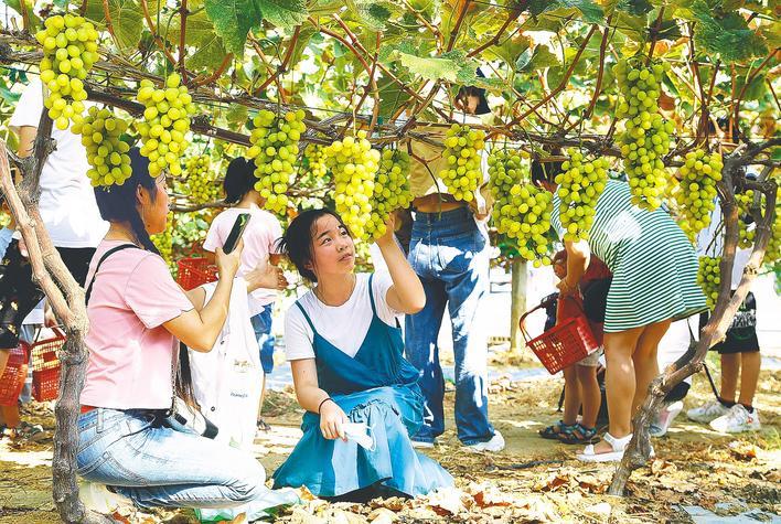 孝昌韵鹤生态园内,阳光玫瑰葡萄成熟,游客一边采摘一边品尝。 (湖北日报全媒记者 汪彤 摄)