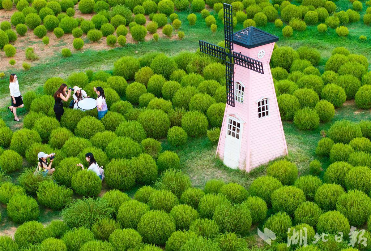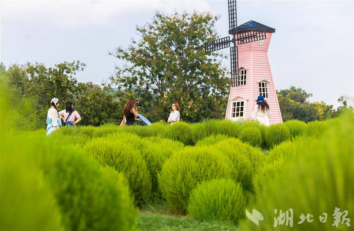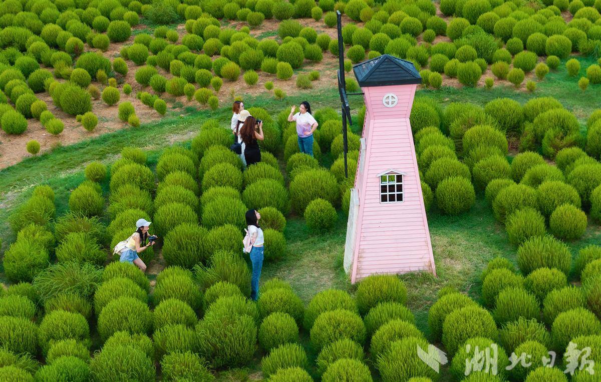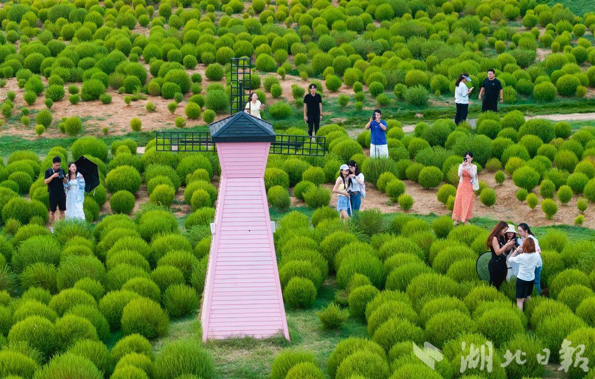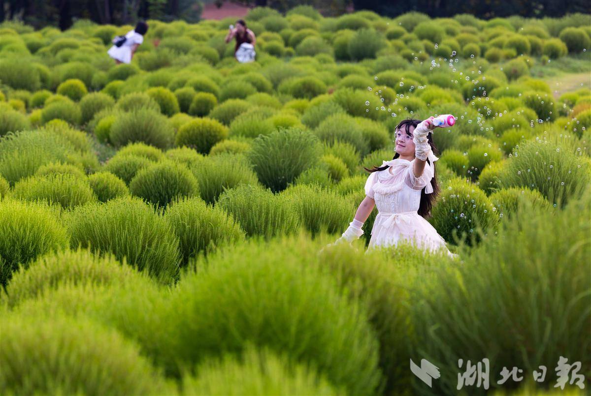 9月7日,武汉马鞍山森林公园,4万余株地肤草披上“绿衣裳”,吸引市民游客打卡游玩。预计9月底到10月初,地肤草将逐渐进入变色期,从青绿转向暖黄、橘红,届时会像打翻的调色盘。(湖北日报全媒记者 薛婷 摄)